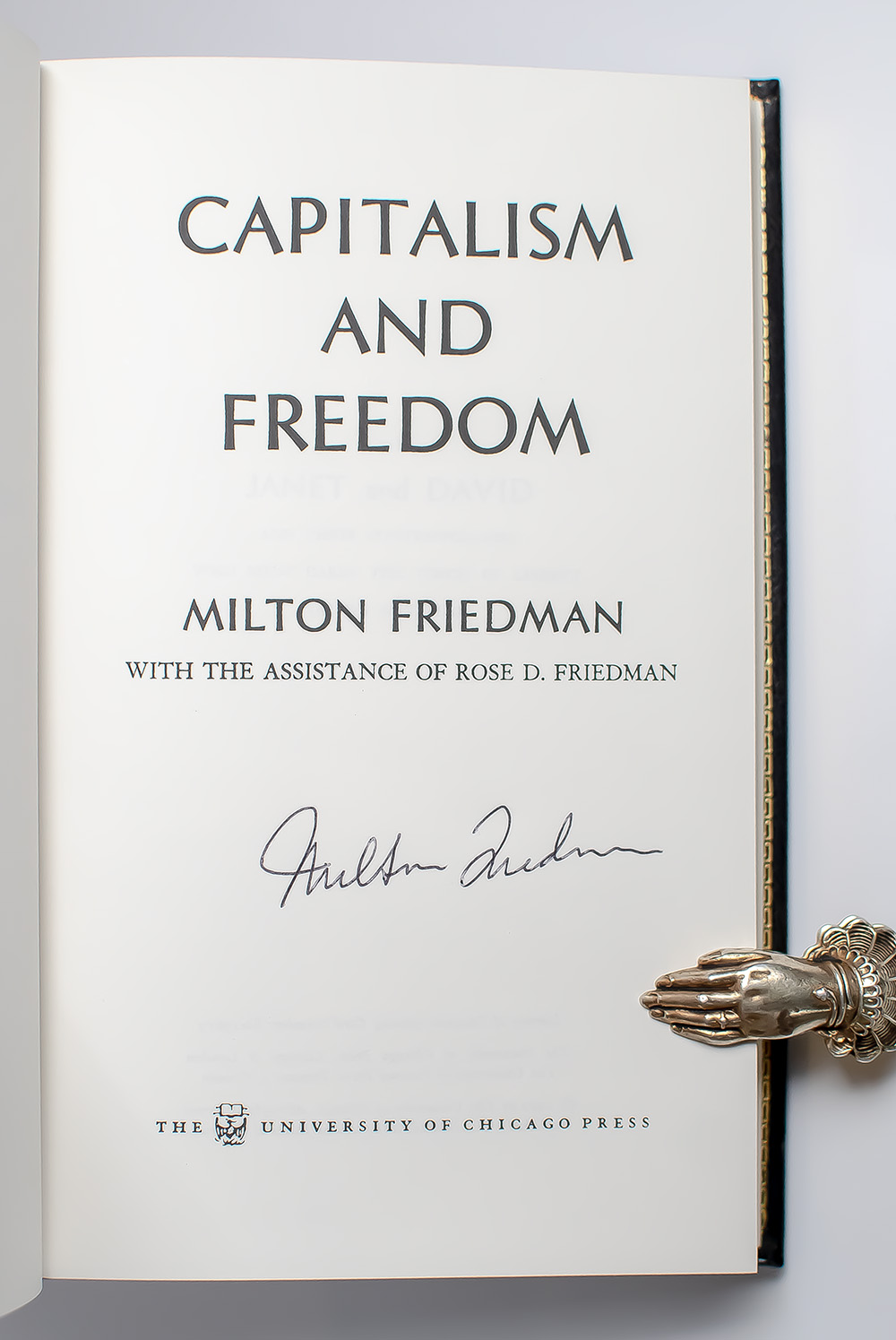 “ECONOMIC FREEDOM IS AN INDISPENSABLE MEANS TOWARD THE ACHIEVEMENT OF POLITICAL FREEDOM”: Rare First Edition of Milton Friedman's Capitalism and Freedom; Signed by Him and Finely Bound by the Harcourt Bindery