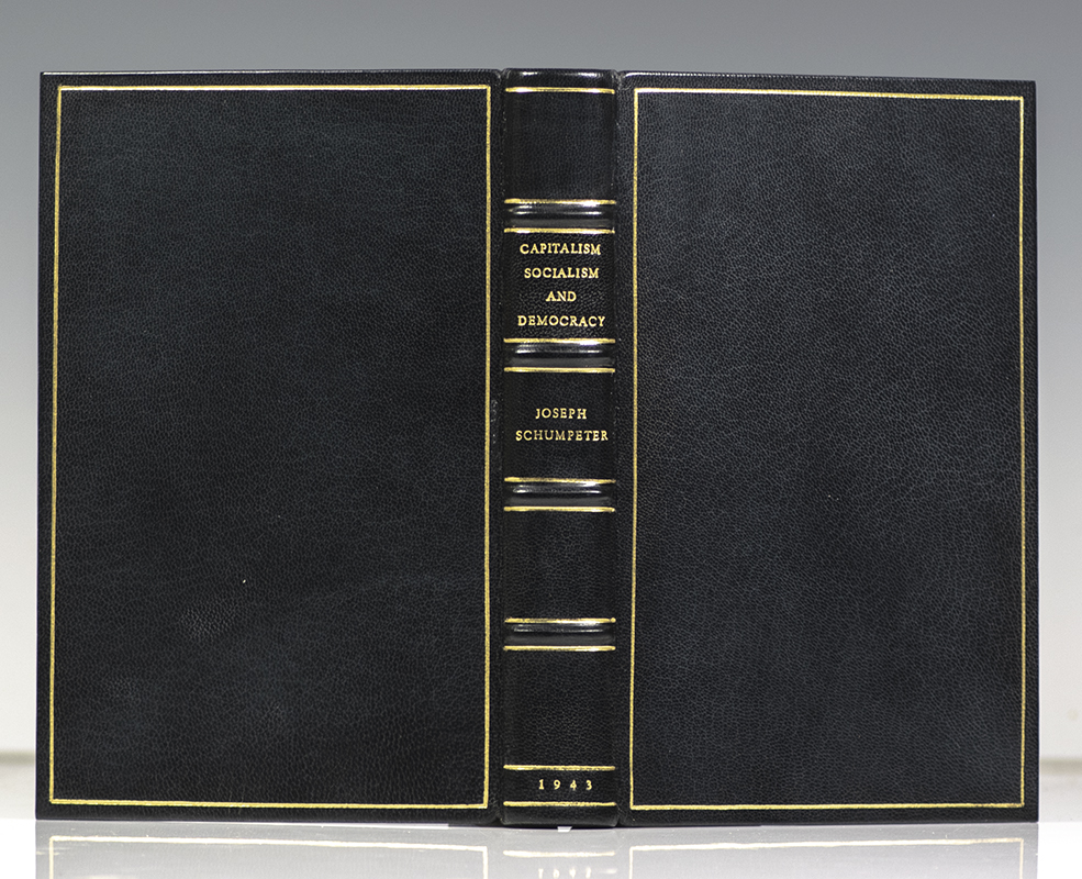First edition of Schumpeter’s ground-breaking work. Octavo, bound in full morocco, gilt titles to the spine, gilt ruled to the front and rear panel, raised bands, marbled endpapers, all edges gilt. In fine condition.