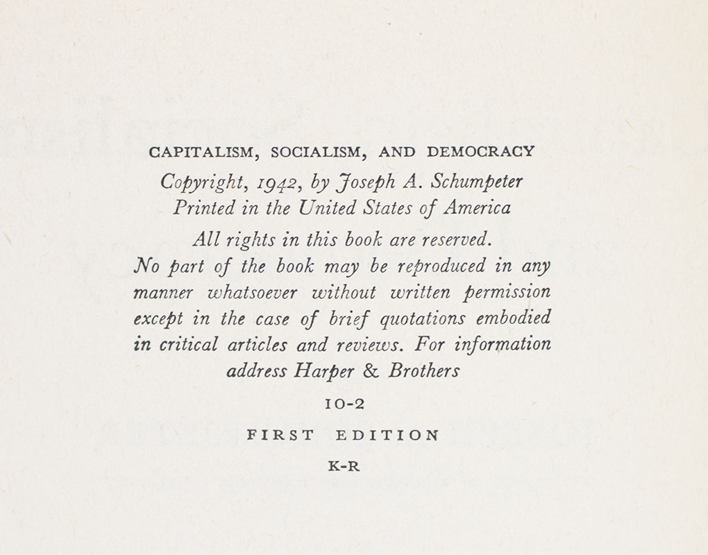 “Capitalism Survive?—I have tried to show that a socialist form of society will inevitably emerge from an equally inevitable decomposition of capitalist society": First Edition of Capitalism, Socialism, and Democracy; In the Rare original dust jacket