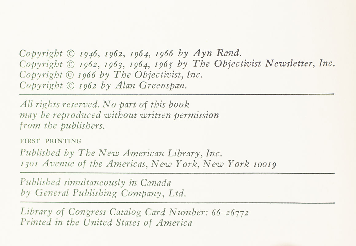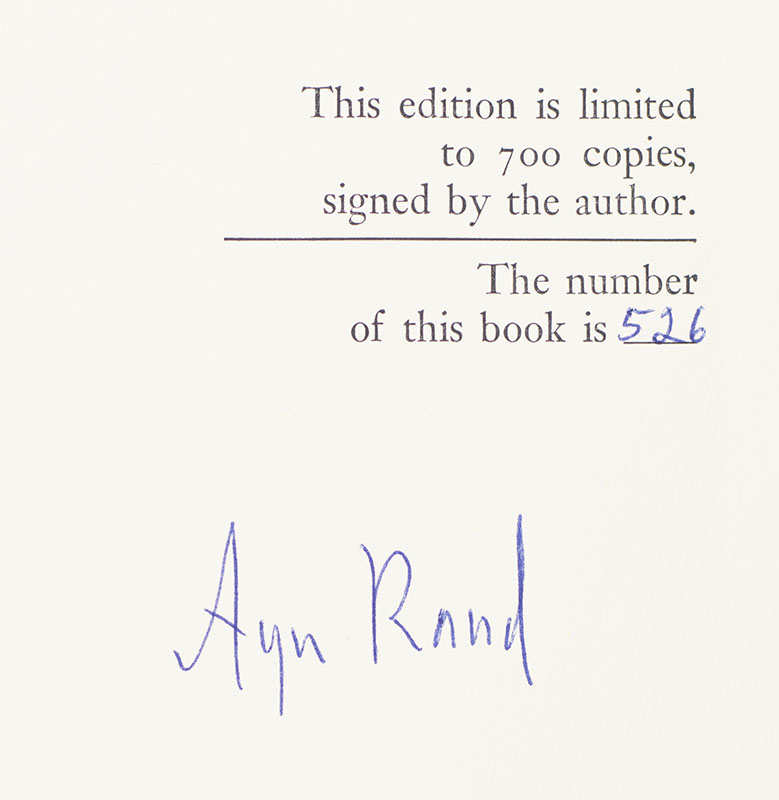 Signed limited first edition of this collection of essays—which Rand, in her introduction, characterizes as “a nonfiction footnote to Atlas Shrugged.” Octavo, original half cloth. Signed by Ayn Rand. Number 526 of 700 signed copies. Fine in a near fine slipcase with light rubbing. With additional articles by Nathaniel Branden, Alan Greenspan, and Robert Hessen.