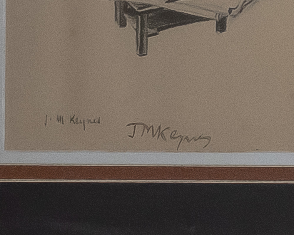 Rare caricature portrait of the "father of macroeconomics." Pencil portrait print of John Maynard Keynes sitting in a chair next to a stool stacked with books and papers. Boldly signed by Keynes next to his facsimile signature on the lower margin. Portrait by Low for The New Statesman and Nation magazine dated October 28, 1933. Triple matted and framed. In near fine condition. The entire piece measures 16 inches by 20.25 inches. An exceptional piece, rare and desirable signed by Keynes.