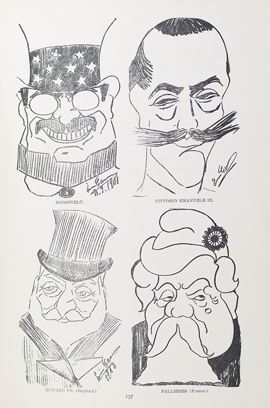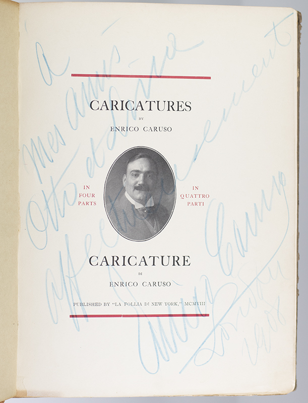 First edition of this compendium of Caruso's caricatures. Quarto, original publisher's half morocco with portrait label, illustrated with 150 pages of lithographed drawings. Presentation copy, with a full-page inscription by Caruso on the title page, "à mes amis Otto et Lina affectueusement Enrico Caruso London 1908". In near fine condition. Exceptionally rare, with no other inscribed copies having appeared at auction in the last 15 years. Caruso visited London only once in 1908 for the Royal Gala concert at the Royal Albert Hall on May 30th.