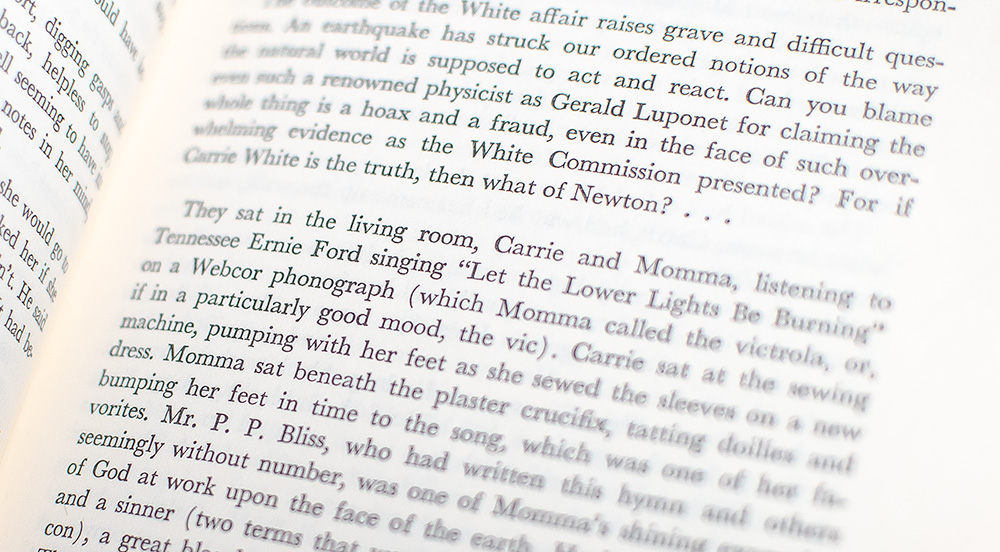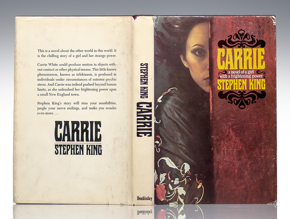 Carrie inaugurated King’s reign as “the best-selling American author during the final quarter of the 20th century” (Chronology of American Literature). When King began writing the book, however, he was living in a trailer and working at a laundromat for $60 a week. “Two unrelated ideas, adolescent cruelty and telekinesis, came together… I did three single-spaced pages of a first draft, then crumpled them up in disgust and threw them away… [The next night, my wife] Tabby had the pages… ‘You’ve got something here,’ she said. ‘I really think you do” (King, On Writing, 67-68). Tabitha King was right. “Life in the trailer ended in 1973 when Doubleday bought Carrie for a $2500 advance. Hardcover sales were not spectacular, but the paperback sales-boosted by the [1976] film of the novel-were nearly 4,000,000 copies. ‘The movie made the book, and the book made me,’ King says” (New York Times).