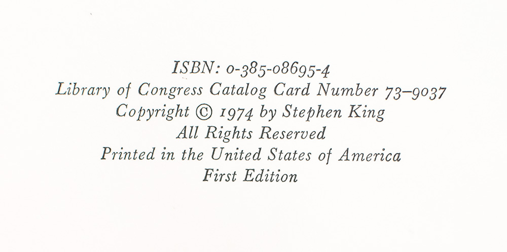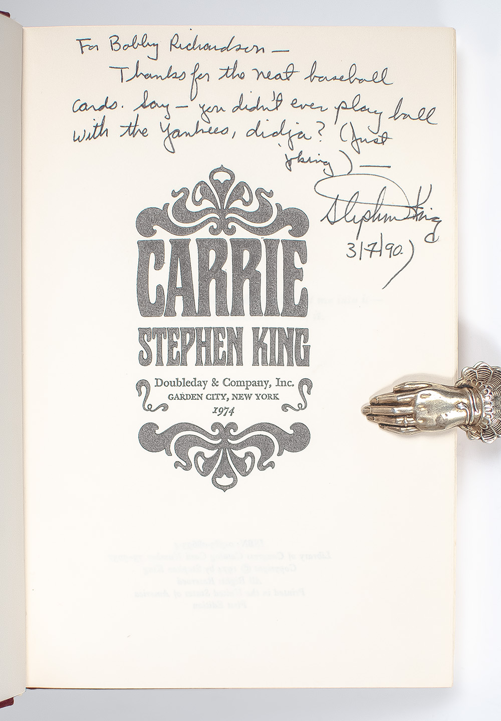 First edition of the novel that launched King's career, with 'First Edition' stated on the copyright page and 'P6' in the gutter of page 199. Octavo, original maroon cloth, compliments stamp to the front pastedown, "With Compliments of Doubleday & Company, Inc." Presentation copy, lengthily inscribed by the author on the title page, "For Bobby Richardson - Thanks for the neat baseball cards. Say - you didn't ever play ball with the Yankees, didja? (Just joking) - Stephen King 3/7/90." The recipient, Bobby Richardson played for the New York Yankees from 1955 through 1966, winning five straight Gold Glove Awards at second base and racking up 1,432 hits in his career. Near fine in a near fine dust jacket. Jacket design and author photograph by Alex Gotfryd.