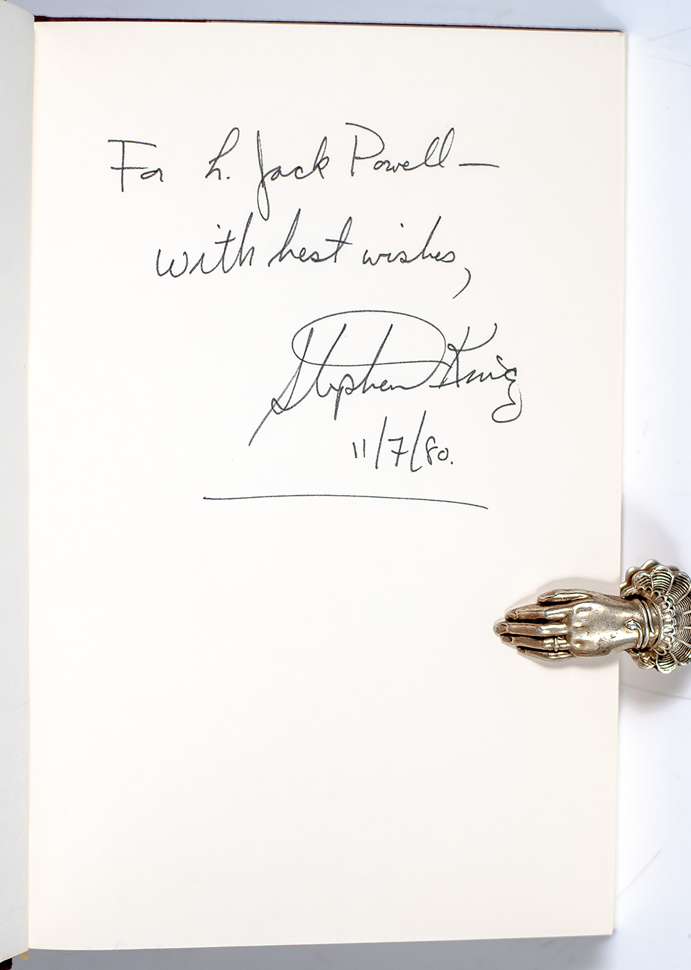 First edition, first printing of the novel that launched King's career, with 'First Edition' stated on the copyright page and 'P6' in the gutter of page 199. Octavo, original maroon cloth. Presentation copy, boldly inscribed by the author on the second endpaper, "For L. Jack Powell - with best wishes, Stephen King 11/7/80." Fine in a fine dust jacket. Jacket design and author photograph by Alex Gotfryd. Housed in a custom half morocco clamshell box. A superior example.