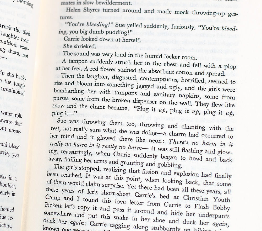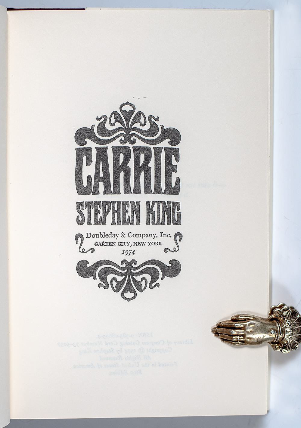 Carrie inaugurated King’s reign as “the best-selling American author during the final quarter of the 20th century” (Chronology of American Literature). When King began writing the book, however, he was living in a trailer and working at a laundromat for $60 a week. “Two unrelated ideas, adolescent cruelty and telekinesis, came together… I did three single-spaced pages of a first draft, then crumpled them up in disgust and threw them away… [The next night, my wife] Tabby had the pages… ‘You’ve got something here,’ she said. ‘I really think you do” (King, On Writing, 67-68). Tabitha King was right. “Life in the trailer ended in 1973 when Doubleday bought Carrie for a $2500 advance. Hardcover sales were not spectacular, but the paperback sales-boosted by the [1976] film of the novel-were nearly 4,000,000 copies. ‘The movie made the book, and the book made me,’ King says” (New York Times).