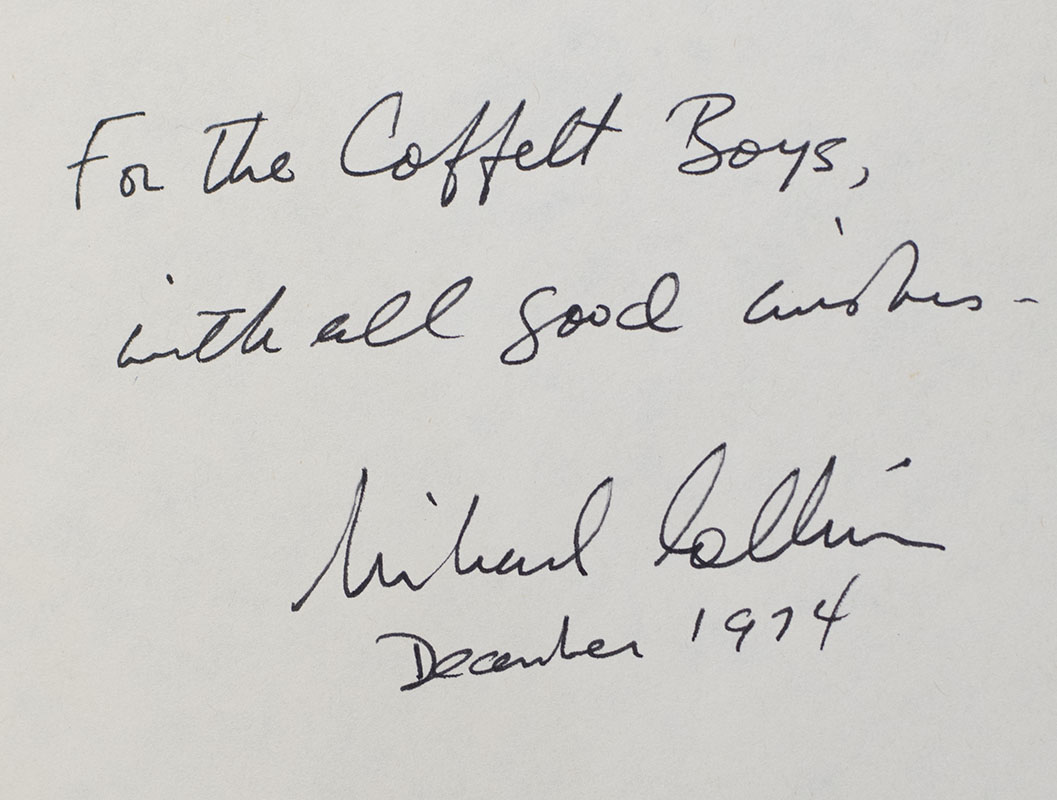 First edition, second printing printed the same year of one of the finest memoirs of space travel. Octavo, original cloth, illustrated. Presentation copy, inscribed by the author on the front free endpaper in the year of publication, "For the Coffelt Boys, with all good wishes- Michael Collins December 1974." Fine in a near fine dust jacket. Jacket design by Robert T. McCall. Foreword by Charles A. Lindbergh.