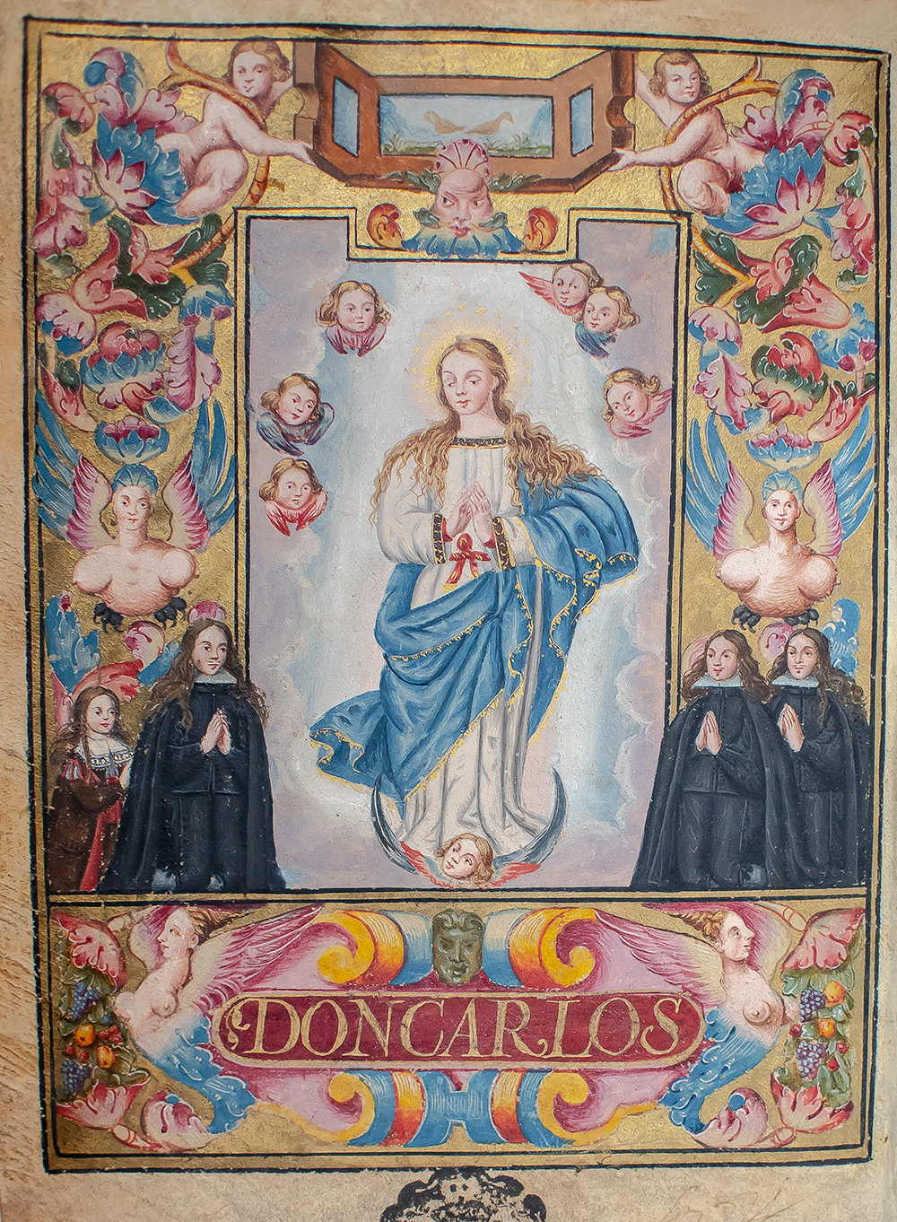 Rare 17th century elaborately illuminated nobility patent of King Carlos II of Spain for the late Diego Merino de Bargas of Tornavacas, represented by two procurators, and his sons Rodrigo, Francisco, and Luis Merino de Bargas, residents of Lugar de Cavecuela. Quarto, bound in early red velvet over pasteboards with red and yellow silk cord on the spine, the patent is comprised of 144 leaves numbered 1-145 in contemporary Arabic numerals, partially illegible ink stamps in bottom margins of each page, manuscript on vellum, written in italic Spanish script within a broad liquid gold border with decorated six-line cadel initials and some in text illuminations. Decorated with two full-pages of illumination depicting the Virgin standing on a crescent moon surrounded by seraphim and cherubim flanked by two kneeling men on the right and two on the left, and an achievement of arms on pages 1 and 2 with a blue silk curtain between, and a smaller illuminated miniature of the king on page 142. In very good condition with the illuminated pages exceptionally bright.