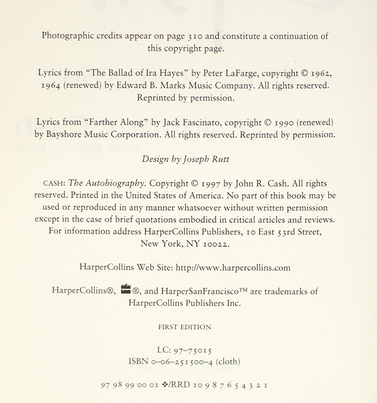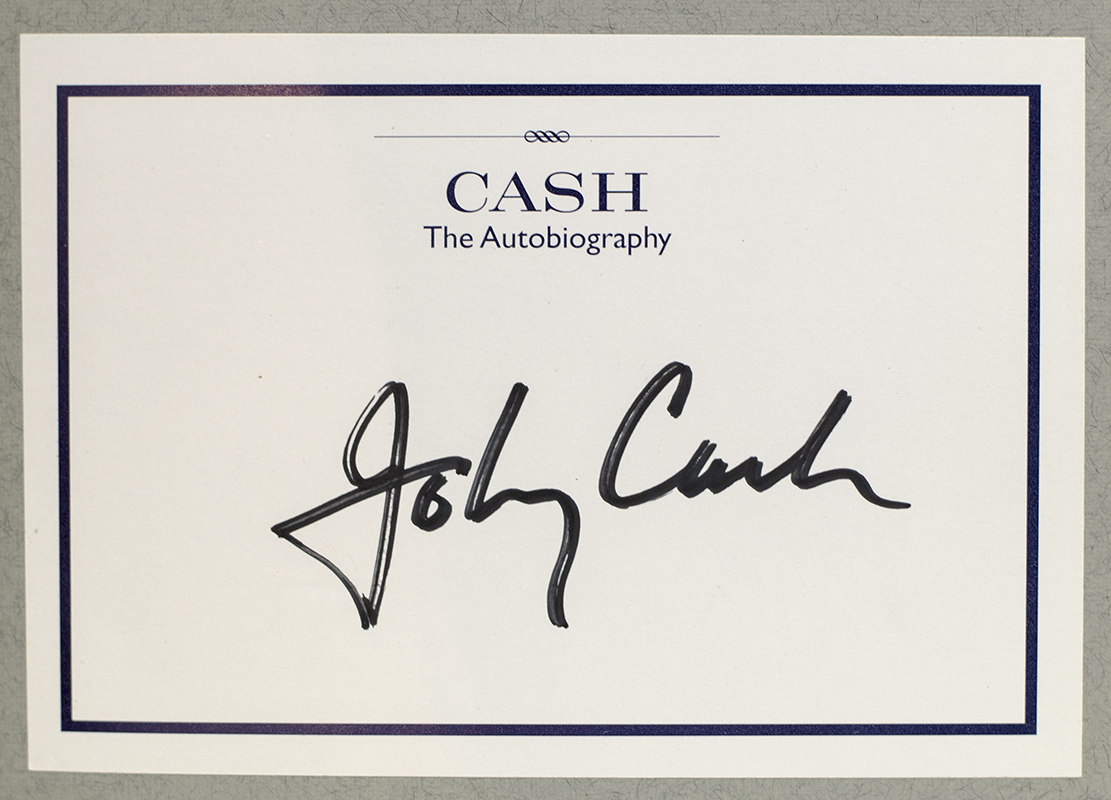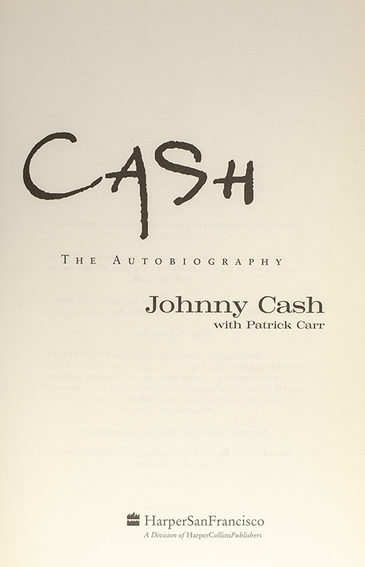 First edition of Cash's autobiography. Octavo, original boards, illustrated. Boldly signed by John Cash on an official bookplate. Fine in a fine dust jacket. Jacket design by Laura Beers. Written with Patrick Carr.