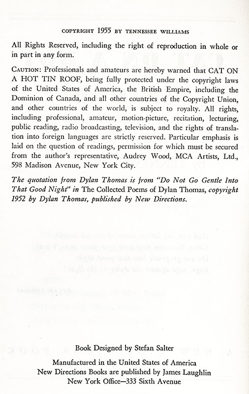"What is the victory of a cat on a hot tin roof?—I wish I knew... Just staying on it, I guess, as long as she can": First Edition, First Issue of A Cat On A Hot Tin Roof; Signed by Tennessee Williams