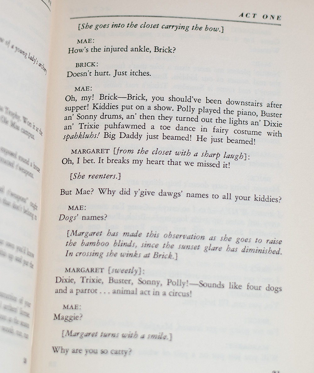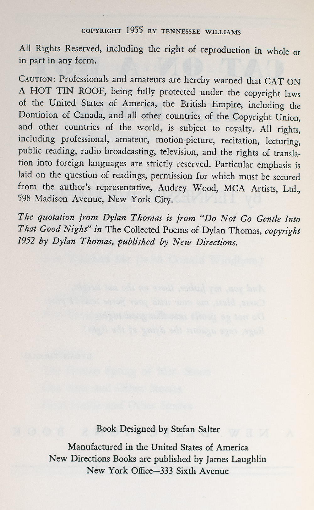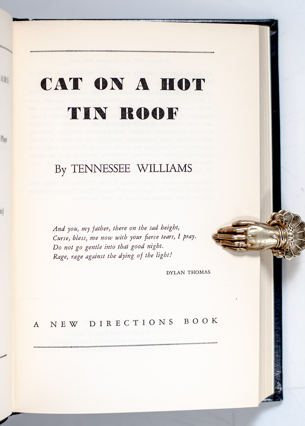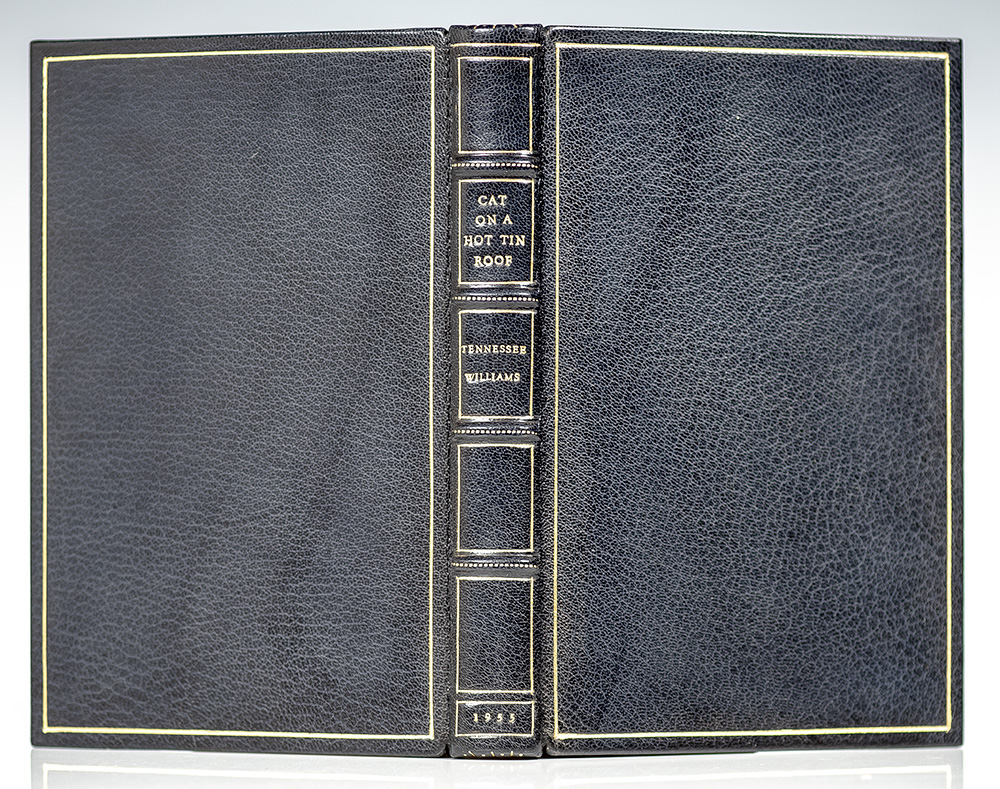 "What is the victory of a cat on a hot tin roof?I wish I knew... Just staying on it, I guess, as long as she can": First Edition A Cat On A Hot Tin Roof; Finely Bound by The Harcourt Bindery and Signed by Tennessee Williams