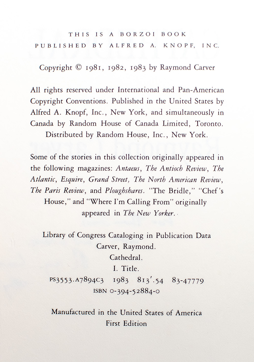 Cathedral was a landmark in Carver's career; shortly after its publication, he said that it was his favorite collection. Cathedral won high critical praise as summoning "remembrances of Hemingway… written with a dry intensity, and moving, at the climaxes, from the commonplace to the unnerving" (New York Times). Nominated for a national Book Critics Circle Award,, Cathedral includes "A Small, Good Thing," first-place winner in 1983 of the prestigious O. Henry Award, as well as "Where I'm Calling From" and the title story.