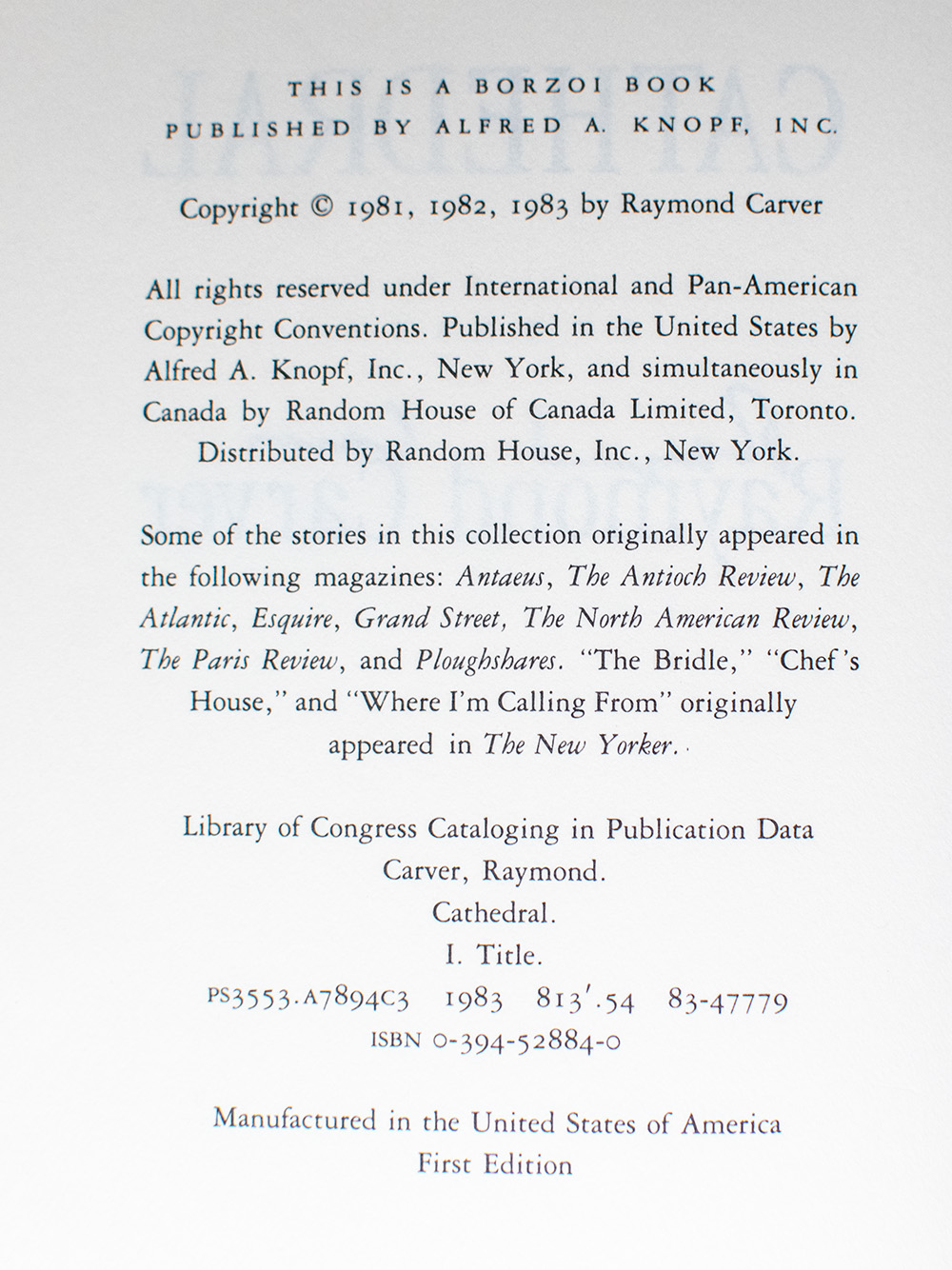 FIRST EDITION OF RAYMOND CARVER’S CATHEDRAL; signed by him