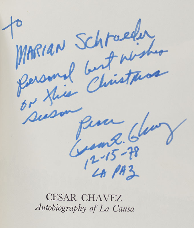 First edition of this biography of the famous labor activist. Octavo, original cloth, photographic endpapers, illustrated with 33 pages of photographs. Presentation copy, lengthily inscribed by Chavez on the half-title page, "To Marian Schroeder personal best wishes on this Christmas season Peace Cesar Chavez 12/15/78 LA PAZ." Fine in a near fine price-clipped dust jacket. Jacket design by Judith Kazdym Leeds. Jacket photograph by Jacques E. Levy.