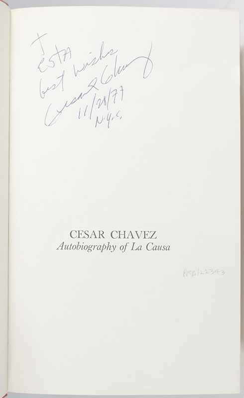 First edition of this biography of the famous labor activist. Octavo, original cloth, photographic endpapers, illustrated with 33 pages of photographs. Presentation copy, inscribed by Chavez on the half-title page, "To Esta best wishes Cesar Chavez 11/28/77 N.Y.C." Fine in a near fine dust jacket. Jacket design by Judith Kazdym Leeds. Jacket photograph by Jacques E. Levy.