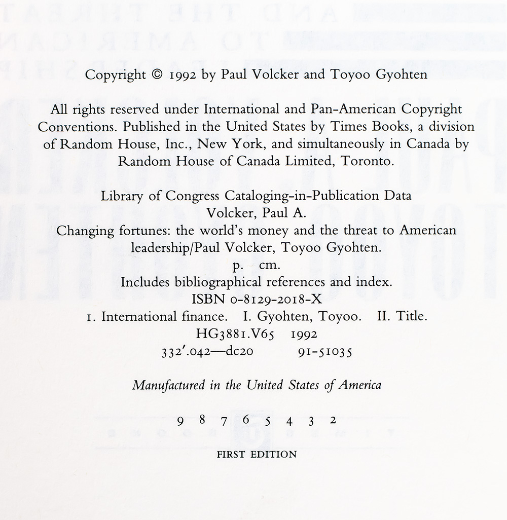 First edition of this work by the former Federal Reserve chairman. Octavo, original half cloth, illustrated. Presentation copy, lengthily and warmly inscribed by the author on the front free endpaper, "6/18/92 To John Petty, Who shared in a lot of these changing fortunes and some of his own! Where have you been? I think they still need us! With great respect and friendship Paul." Fine in a fine dust jacket. Jacket design by Marjorie Anderson. Jacket illustration by Lawrence Ratzkin.
