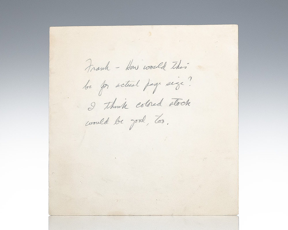 Exceptionally rare original manuscript mock-up of Charles Schulz's square-shaped Peanuts books. Manuscript booklet completely in the hand of Charles Schulz, featuring a full-page drawing, in pencil, of Snoopy as the World War I Flying Ace, "Here I am flying high over the enemy lines." Inscribed on the front page, "Frank - How would this be for actual page size? I think colored stock would be good, too." Frank Close was a sales manager at his publisher Holt, Rhinehart and Winston. In near fine condition. The piece measures 7 inches by 7 inches.