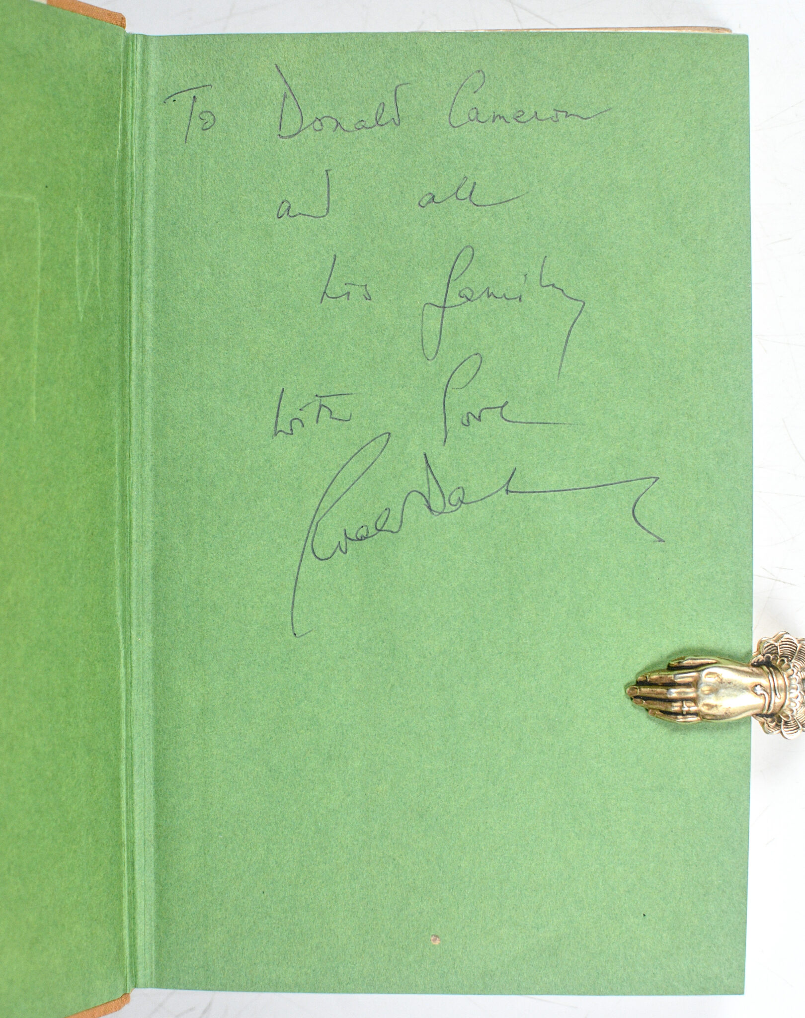 First edition, early printing of the author's classic work. Octavo, original half-cloth, illustrated throughout. Presentation copy, inscribed by the author on the front free endpaper, "To Donald Cameron and all his family with love Roald Dahl." Near fine in a very good price-clipped dust jacket. Illustrated by Joseph Schindelman.