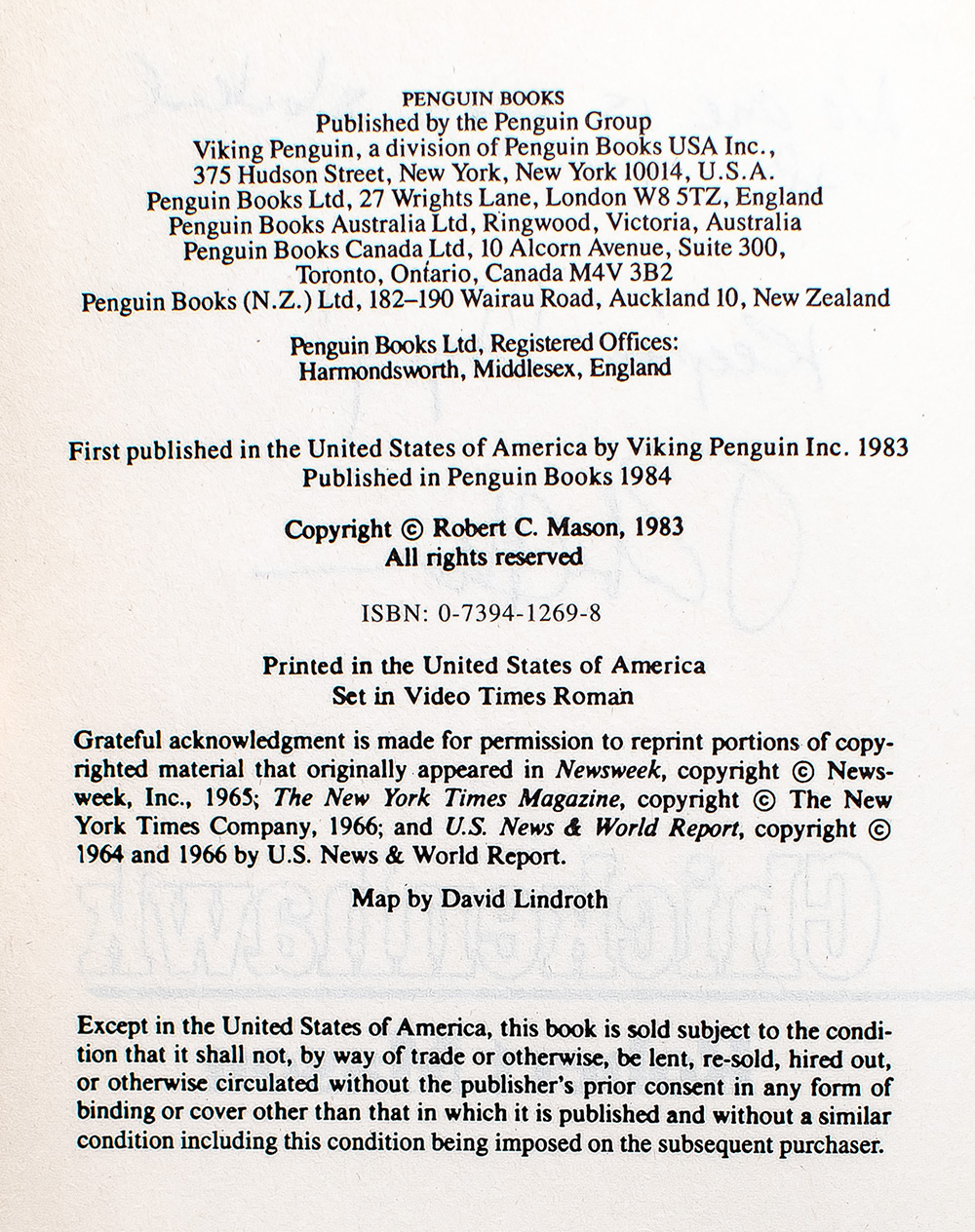 First edition, early printing of Mason's classic first book, one of the finest about the Vietnam War. Octavo, original cloth, map by David Lindroth. Lengthily inscribed by the author on the half-title page, "'No one is more shocked than I.' Keep 'em flying! Robert Mason." Fine in a near fine price-clipped dust jacket. Jacket illustration by Peter Cox.