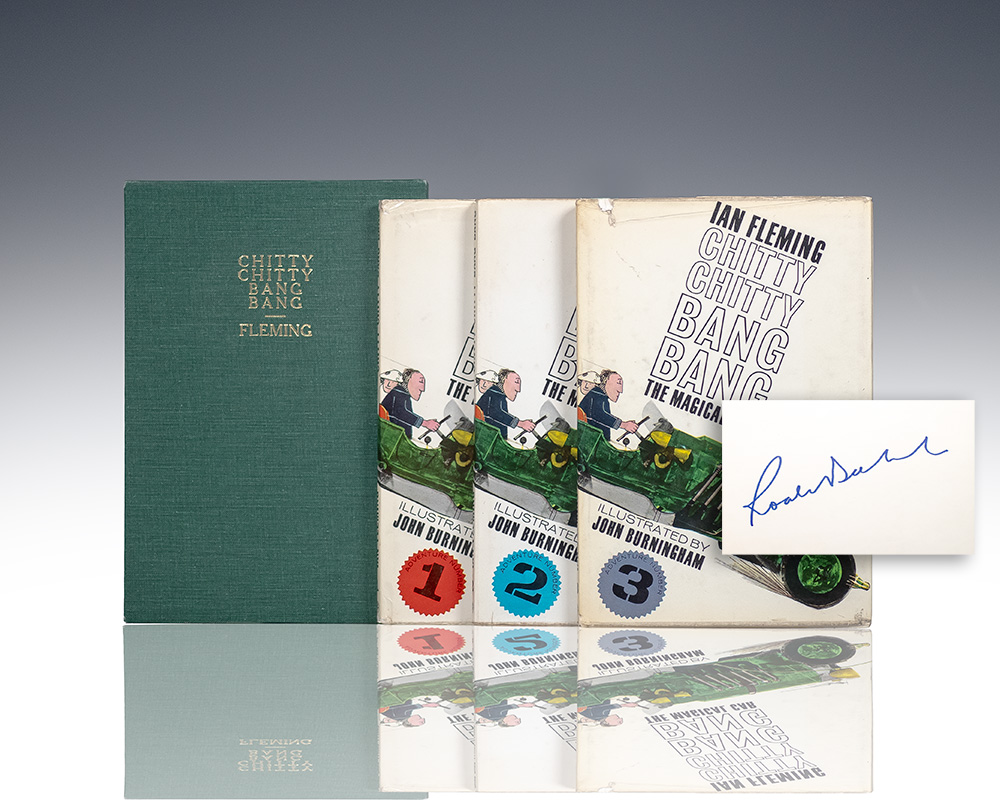 First editions of all three volumes of Fleming's rare children's novel. Octavo, three volumes, original pictorial boards, pictorial endpapers, illustrated by John Burningham. Adventure Number One is signed by Roald Dahl who co-wrote the screenplay for the 1968 film adaptation opposite the half-title page, very good in a very good price-clipped dust jacket. Adventure Number Two is very good in a very good in a very good price-clipped dust jacket. Adventure Number Three is from the collection of Harry Saltzman, who co-produced the first nine James Bond films with Albert R. Broccoli. Housed in a custom green cloth slipcase. Rare and desirable signed.