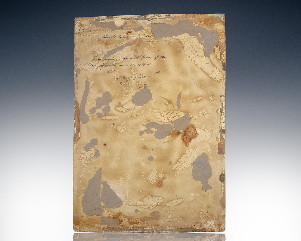 Rare original watercolor painting of Emerald Bay. Folio, a dark, moody impression of Emerald Bay at the southeast corner of Lake Tahoe, by the noted Norwegian-American landscape painter Christian August Jorgensen. Annotated on the verso by his son and inaccurately titled: "Emerald Lake - Lake Tahoe. This painting was made by my father Chris Jorgensen in (or about) 1925. Signed Virgil W. Jorgensen, 8/11/36." In very good condition with a few small pinholes to the edges, light horizontal crease to the top edge, evidence of framing to the margins, paper and glue residue to the verso. The piece measures 10 inches by 14.25 inches.