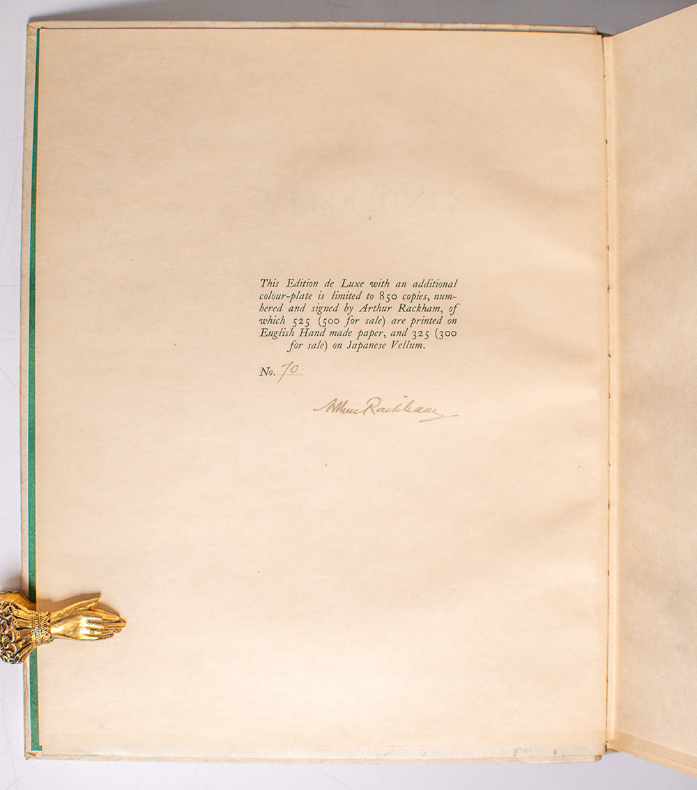 Edition de Luxe, signed limited issue of Arthur Rackham's illustrated rendition of the beloved children's classic. Quarto, original publisher's vellum-backed pictorial boards decorated in gilt, pictorial green endpapers, top edge gilt, tipped-in color frontispiece by Arthur Rackham, illustrated. One of 325 copies on Japanese vellum signed by Arthur Rackham on the limitation page, this is number 70. In very good condition. Housed in the original custom slipcase.
