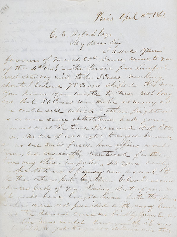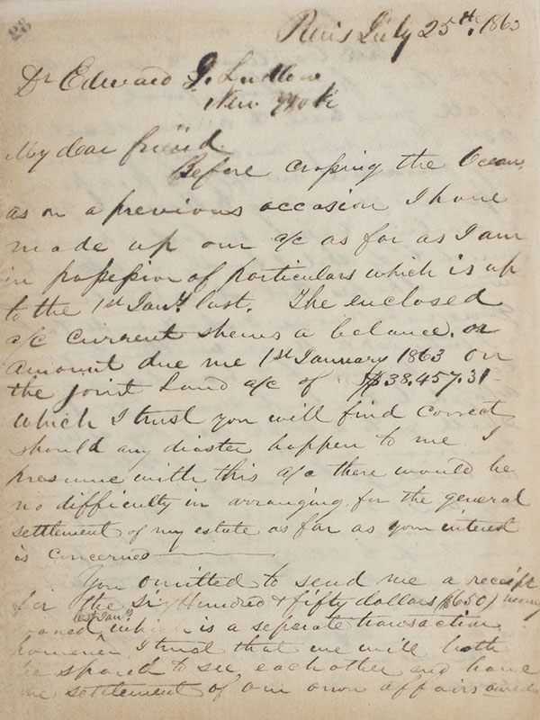 Rare collection of American Civil War era letters written by American business magnate J. K. Smythe concerning business between Europe and America during the initial years of the war. Quarto bound into two volumes in half-cloth over pebbled boards by Auguste Bellance of Paris, with marbled endpapers and a paper title label with Smythe's signature affixed to the front panel of the first volume. Written by Smythe in Paris between 1858 and 1863, the collection includes several early letters regarding the sale and purchase of lots in New York City including proposals by Smythe to sell his lots in Harlem bordering Central Park and to purchase property on Broadway and in Manheim in addition to a letter concerning a house being built for Smythe in New York by architect Calvert Vaux who had just designed Central Park with Frederick Law Olmsted. Beginning in 1861, the letters contain several comments regarding the excitement in the state of the Union at the outbreak of the American Civil War, including a letter dated May 1961 which reads in part, "You of course get the news of the intense excitement in all the northern States in regard to the War they are inaugurating to put down rebellion - Persons who came over by the last Steamer say the excitement and Patriotism of the people can hardly be described. The Americans here are also very much excited." In very good condition. A fascinating collection.