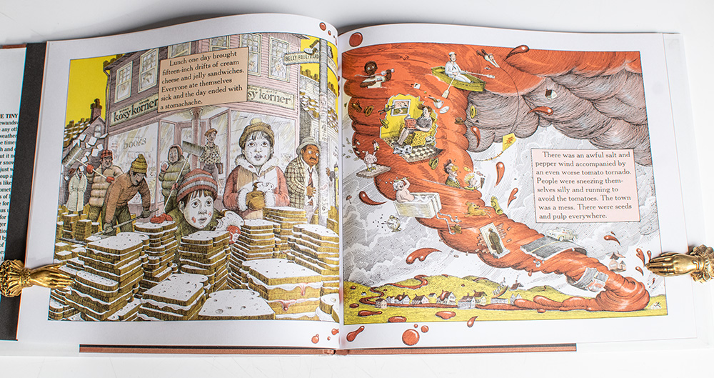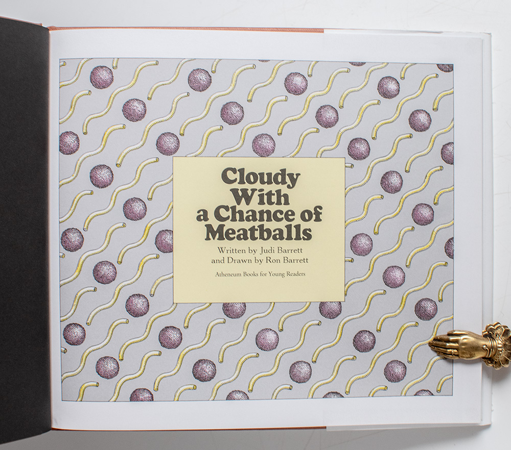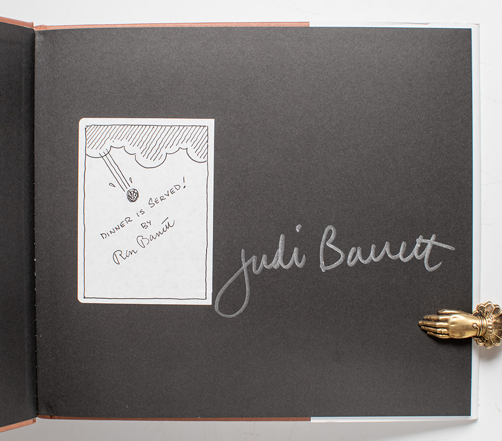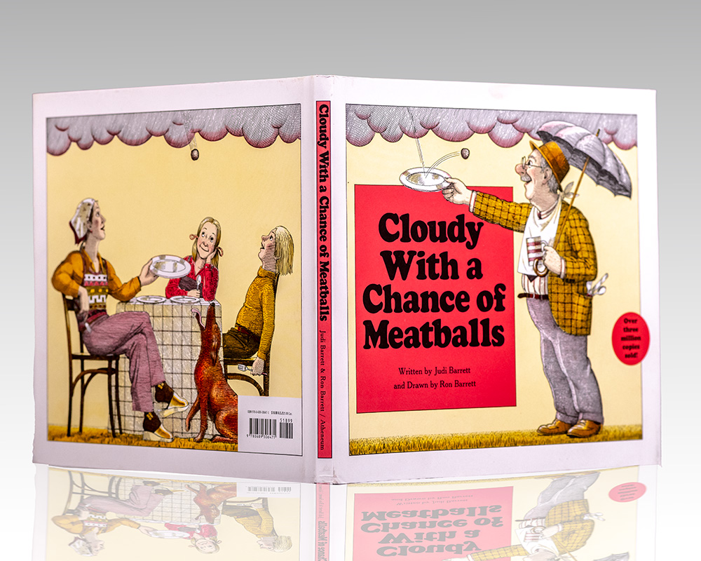 First edition, early printing of this children's classic. Oblong quarto, original boards, illustrated throughout. Signed by Judi Barrett on the front free endpaper with a bookplate next to her signature and signed by Ron Barrett, who has added a drawing of a meatball falling from the clouds, "Dinner is served! Ron Barrett." Fine in a near fine dust jacket.