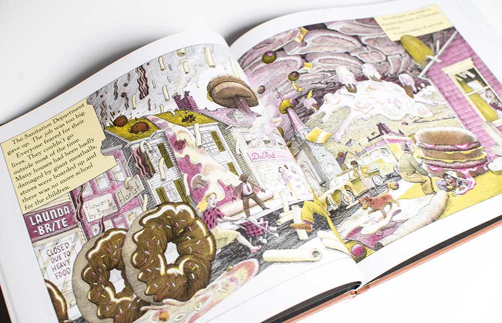 Cloudy With A Chance of Meatballs details a bedtime story narrated by a grandfather to his grandchildren, chronicling the daily lives of the citizens of an unordinary town called Chewandswallow characterized by its strange daily meteorological pattern that provides the townsfolk with all of their required daily meals by raining food. Based on a 2007 online poll, the National Education Association named the book one of its "Teachers' Top 100 Books for Children". It was one of the "Top 100 Picture Books" of all time in a 2012 poll by School Library Journal. It was made into the 2009 animated film featuring the voices of Bill Hader, Anna Faris, Bruce Campbell, James Caan, Bobb'e J. Thompson, Andy Samberg, Mr. T, Benjamin Bratt, Neil Patrick Harris, Al Roker, Lauren Graham, and Will Forte.