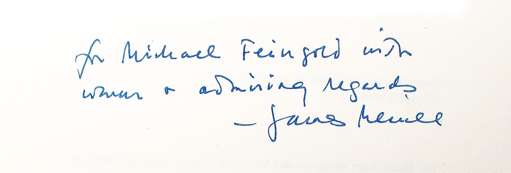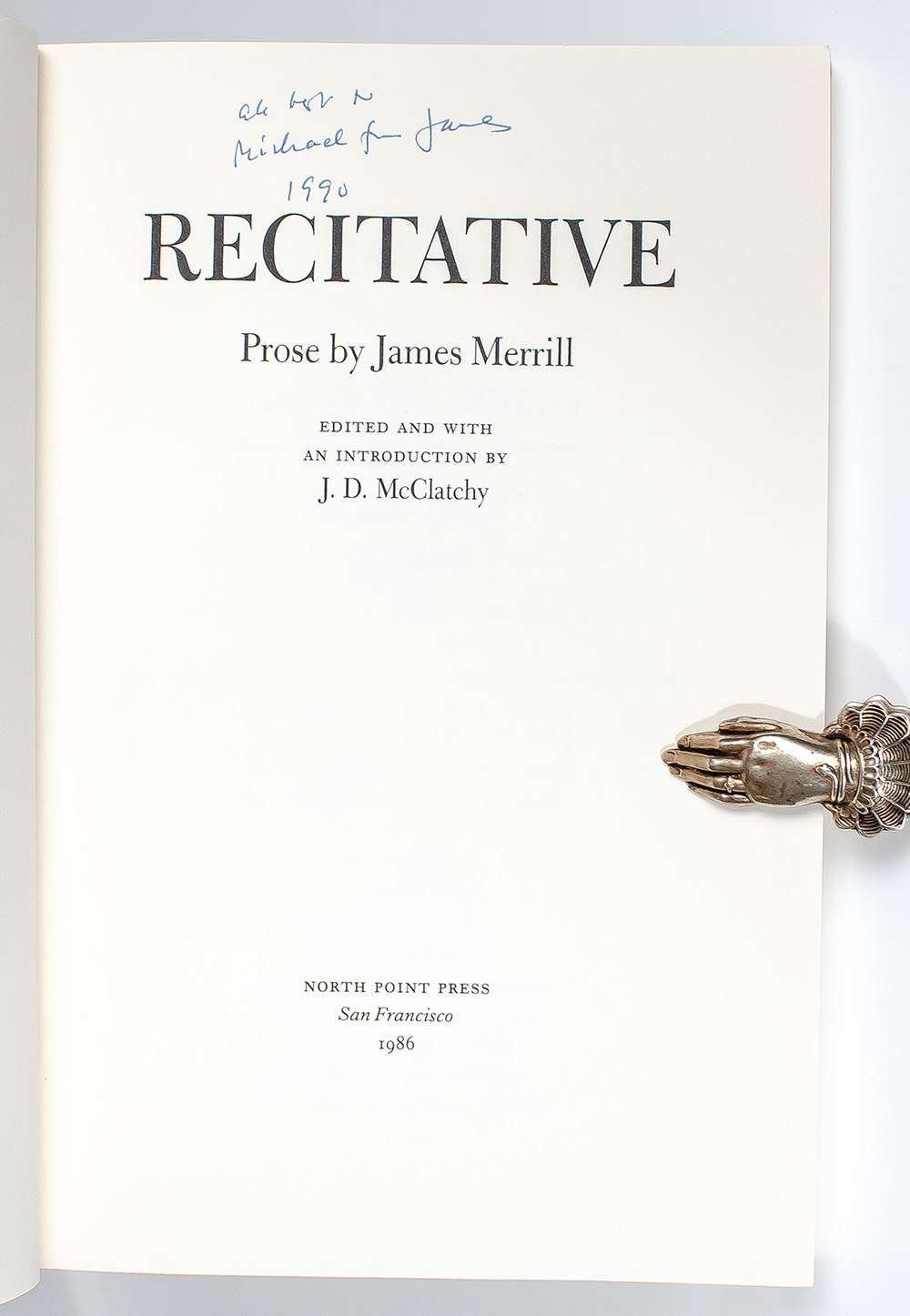 Collection of six first editions of the works of James Merrill; from the library of American playwright Michael Feingold. Octavo, six volumes, original cloth and wrappers, the collection includes: Stated first edition of 'Scripts for the Pageant' [New York: Atheneum, 1980]; Stated first edition of 'From the First Nine: Poems 1946-1976' [New York: Atheneum, 1982]; Stated first edition of 'The Changing Light at Sandover: Including the Whole of The Book of Ephraim, Mirabell's Books of Number, Scripts for the Pageant, and a new coda, The Higher Keys' [New York: Atheneum. 1982]; Stated first edition of 'Late Settings: Poems' [New York: Atheneum, 1985]; First edition of 'Recitative: Prose' [San Francisco: North Point Press, 1986]; Stated first edition of 'A Different Person: A Memoir' [New York: Alfred A. Knopf, 1993, illustrated with photographs]. Association copies, each volume inscribed by the author on the title page to American critic, playwright, and translator Michael Feingold. All in very good condition with the exception of 'The Changing Light at Sandover' which is in good condition.