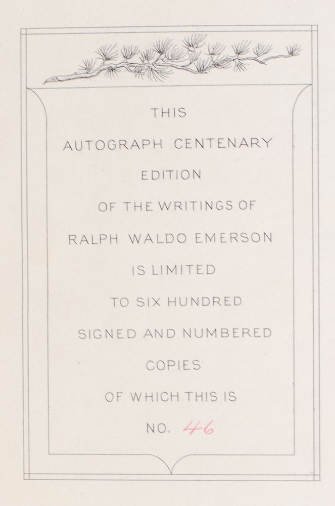 THE AUTOGRAPH CENTENARY EDITION OF THE WORKS OF RALPH WALDO EMERSON; complete with a double-sided manuscript page entirely in Emerson's hand