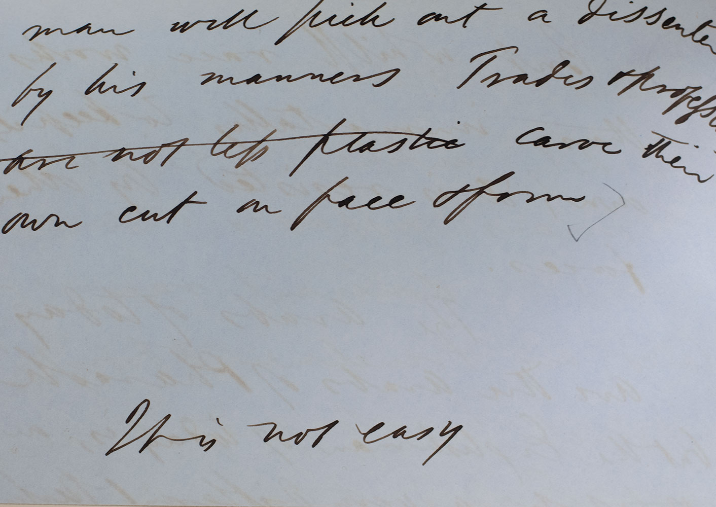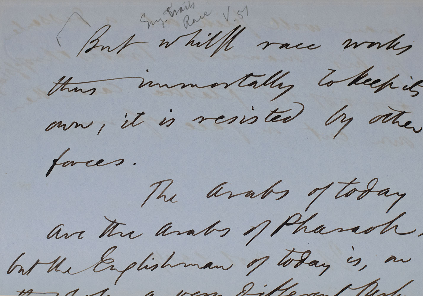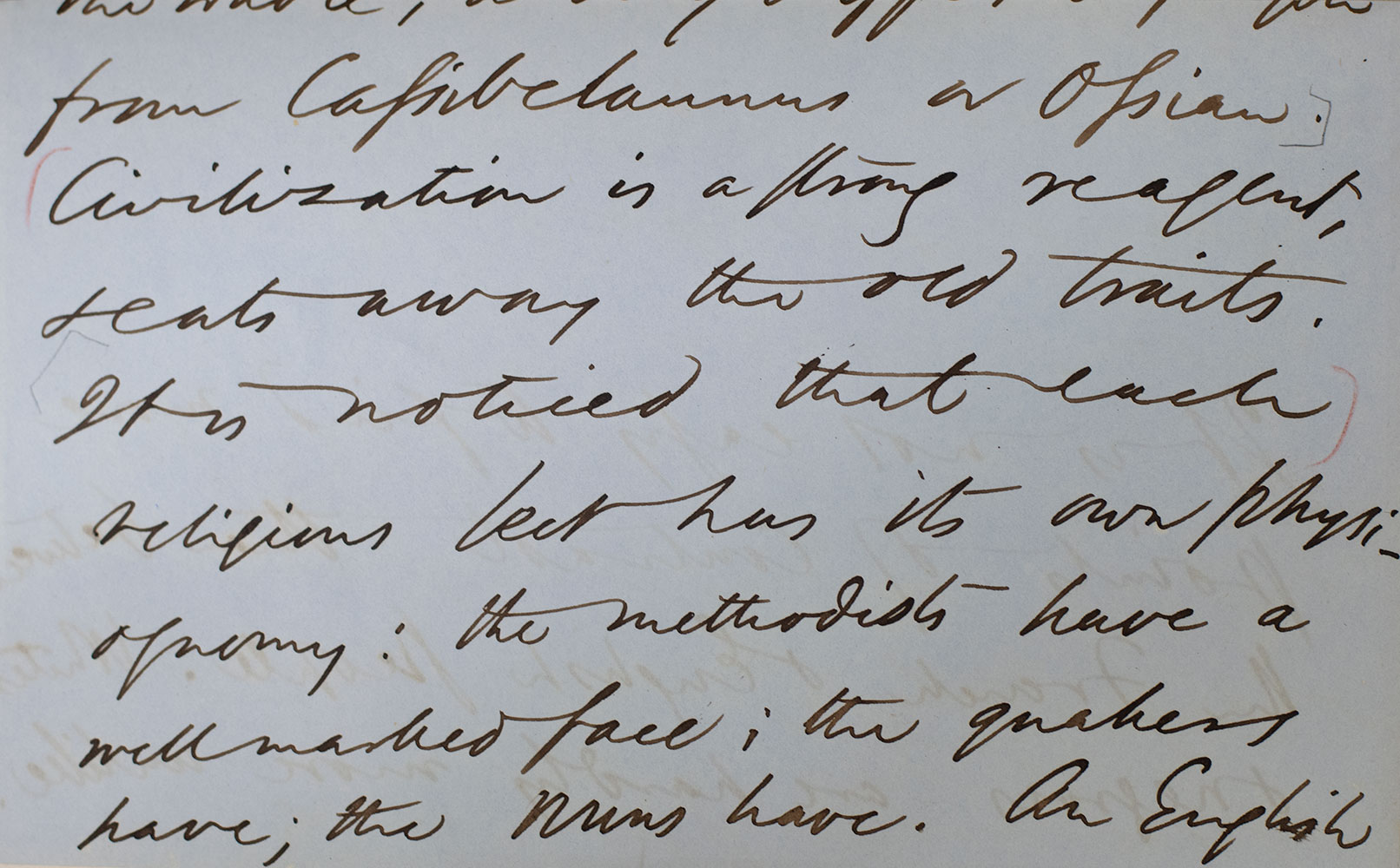 The Autograph Centenary edition of the writings of Ralph Waldo Emerson, one of 600 numbered copies containing a double sided manuscript in Emerson’s hand bound into volume one. Octavo, 12 volumes, publisher's original three quarter morocco over marbled boards with gilt titles and tooling to the spine in six compartments within raised bands, top edge gilt, illustrated with numerous mounted photogravures. One of 600 numbered copies signed by the publisher, this is number 46. The original manuscript reads, "But whilst race works thus immortally to keep its own, it is resisted by other forces. The Arabs of today are the Arabs of Pharaoh, but the Englishman of today is, on the whole, a very different Person... Civilization is a strong re-agent, and eats away the old traits. It is noticed that each religious sect has its own physiognomy. The Methodists have a well marked face; the Quakers have, the nuns have. An English man will pick at a dissenter by his manners. Trades and professions... carve their own lines on face and form. This is not easy. It is not easy to find more points of contrast than between the French and English people. Whites and negroes are hardly more unlike." In near fine condition.