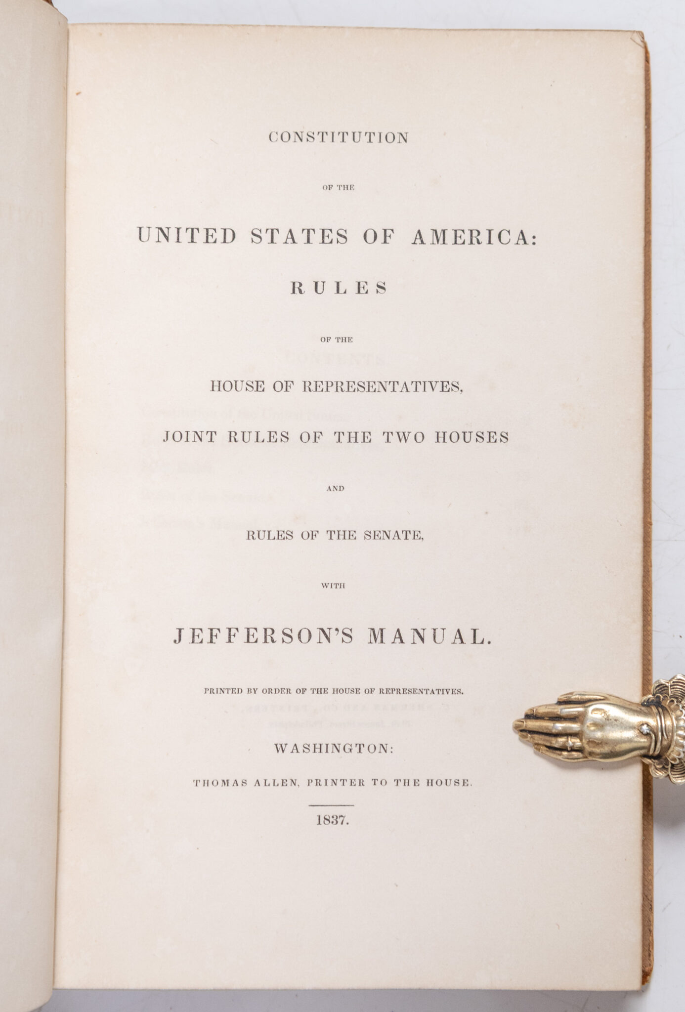 First edition of the official compilation of United States congressional procedures, incorporating Thomas Jefferson’s Manual of Parliamentary Practice together with the governing rules of the House of Representatives, Senate, and the joint rules of Congress. Royal octavo, bound in full contemporary calf, black morocco spine label lettered in gilt. Sabin 16106. In very good condition, ownership inscription to the front free endpaper. Rare.