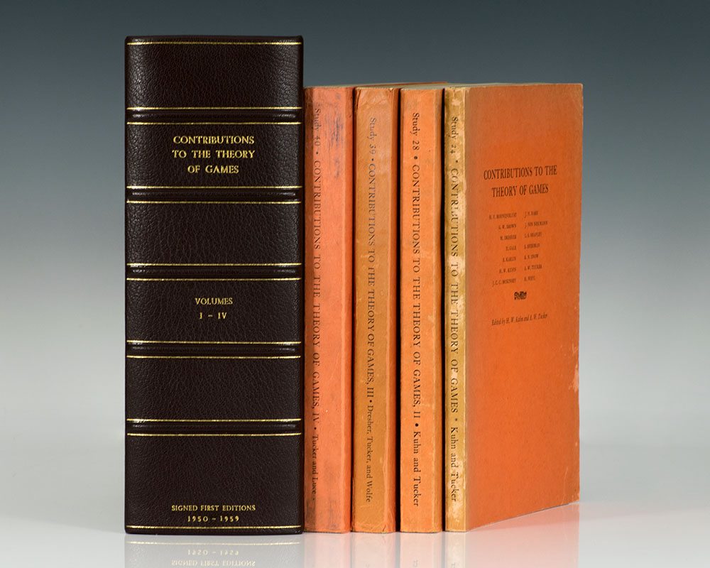 First edition of each work in this ground-breaking four volume work on game theory. Octavo, 4 volumes, original orange wrappers. Volume one is signed by contributors John von Neumann and John Nash on the title page. Contains the article by the Nobel Prize-winning economist entitled, "A Simple Three Person Poker Game." Volume II is signed by contributors Kenneth J. Arrow and John Milnor. Volume III is signed by contributors W.H. Fleming and Philip Wolfe on the title page. Volume IV is signed by contributors Robert J. Aumann and Martin Shubik. In near fine condition with some rubbing and wear. Housed in a custom half morocco clamshell box. An exceptional set, most rare and desirable signed by von Neumann and other contributors.