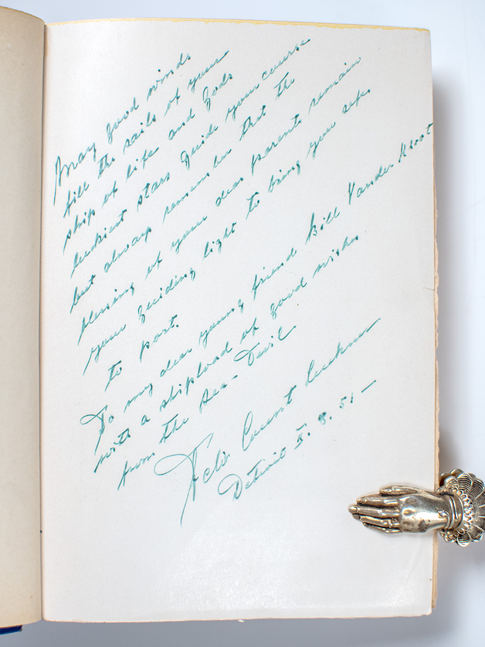 First edition of this captivating biography of German nobleman and naval officer Count Felix von Luckner. Octavo, original publisher's cloth, top stain yellow, cartographic endpapers, frontispiece of Count Felix von Luckner, illustrated with black and white photographs and drawings. Association copy, inscribed by Luckner on the verso of the frontispiece, "May good winds fill the sails of your ship of life and God's luckiest stars guide your course but always remember that the pleasing of your dear parents remain your guiding light to bring you safe to port. To my dear young friend Bill Vanderkloot with a shipload of good wishes from the Sea-Devil, Felix Count Luckner, Detroit, II.8.51." The recipient, William Vanderkloot was an American pilot who played a notable role during World War II as a civilian aviator entrusted with high-priority missions for the British government. Most famously, he piloted Prime Minister Winston Churchill on several wartime flights, including a critical journey to Moscow in 1942, demonstrating both exceptional skill and the strategic importance of transatlantic aviation in Allied diplomacy. Very good in a very good dust jacket. Rare and desirable signed and inscribed.