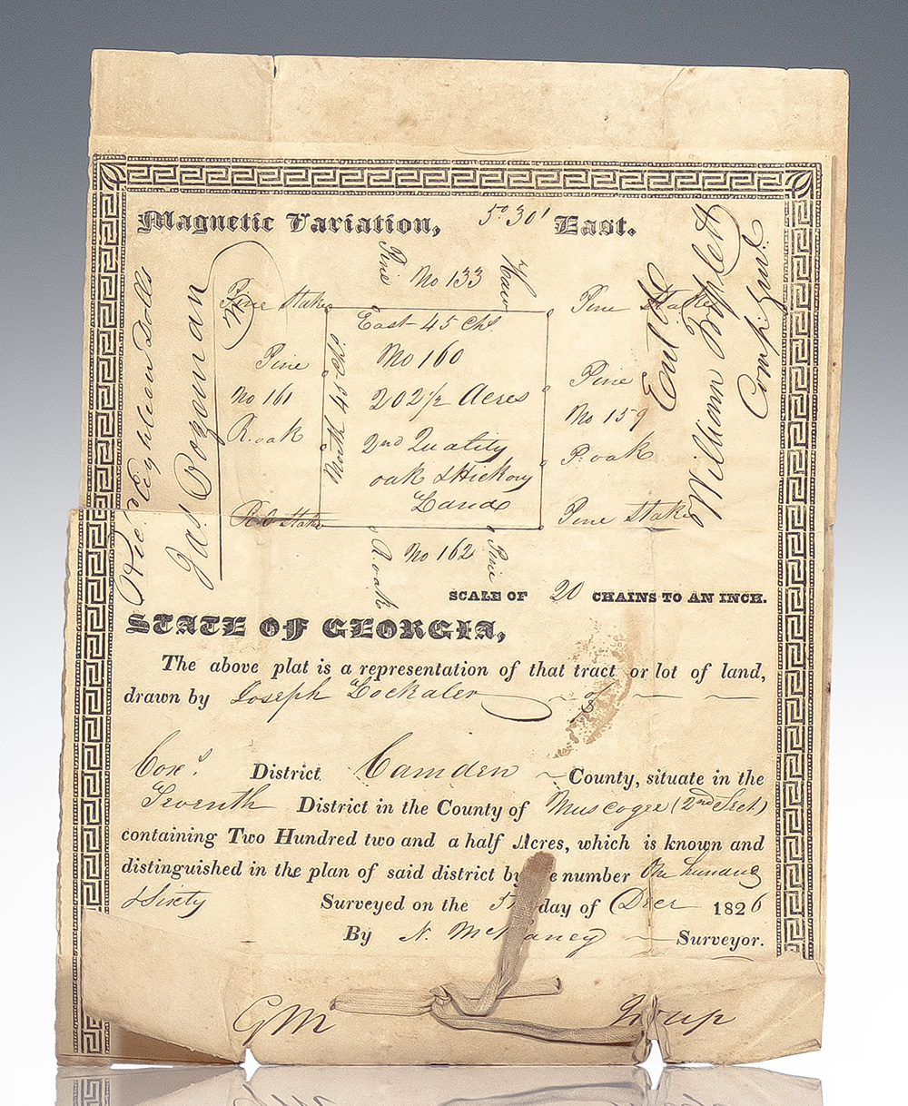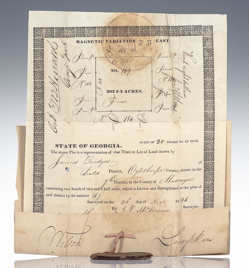 Four rare 19th century Creek Indian land surveys and lottery winning land grants signed by 3 different Georgia Governors. Octavo, eight pages partially printed and accomplished in manuscript, the collection includes: grant for land lot 156 in Muscogee County, Georgia, surveyed in 1826 and granted in 1832 to David Maw, signed by Wilson Lumpkin at the bottom edge, official wax seal attached by a pale red ribbon; grant for land lot 167 in Muscogee County, Georgia, surveyed in 1826 and granted in 1832 to James Bridges, signed by Wilson Lumpkin at the bottom edge, official wax seal attached by a pale red ribbon; grant for land lot 160 in Muscogee County, Georgia, surveyed in 1826 and granted in 1827 to Joseph Lockaler, signed by Georgia Governor George M. Troup at the bottom edge, tied with a pale red ribbon but missing the official wax seal; grant for land lot 166 in Muscogee County, Georgia, surveyed in 1826 and granted in 1830 to Widow Martha Sayer, signed by Governor George Gilmer at the bottom edge, official wax seal attached by a pale red ribbon. In very good condition with some toning, a few closed tears. The pieces measure approximately 9.75 inches by 8 inches.
