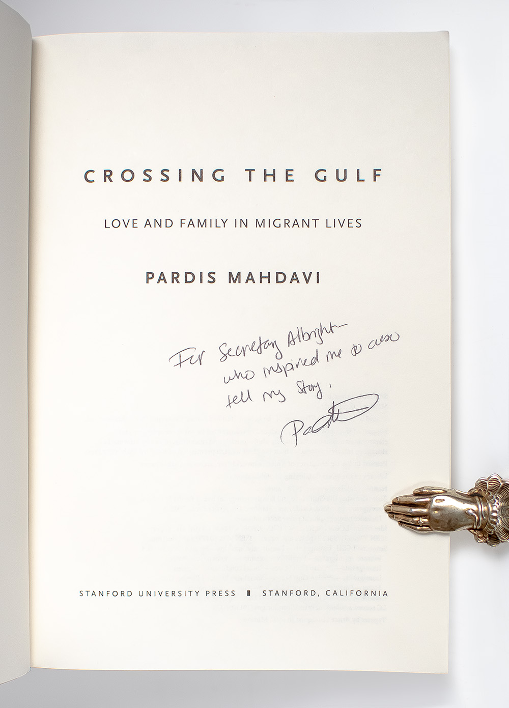 First edition of Mahdavi's Crossing the Gulf: Love and Family in Migrant Lives; Inscribed by Her to Secretary of State Madeleine Albright