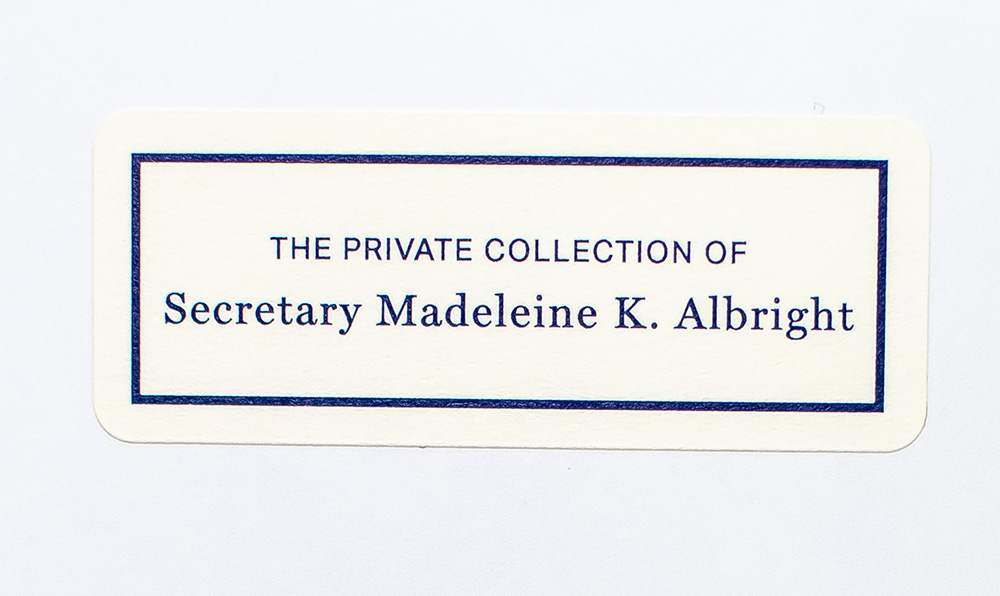 First edition of this intricate dynamics of migration in the Gulf cities of Dubai, Abu Dhabi, and Kuwait City. Octavo, original publisher's wrappers. Presentation copy, inscribed by author on the front free endpaper, "For Secretary Albright- who inspired me to tell my story. Pardis Mahdavi." The recipient, Madeleine K. Albright was the first woman to serve as the U.S. Secretary of State. She acted under President Bill Clinton from 1997 to 2001, leading the United States through foreign policy in the Middle East with the endorsement of military action in Iraq. At the 1998 NATO summit, Albright coined the “3 Ds” of NATO, “which is no diminution of NATO, no discrimination and no duplication – because I think that we don’t need any of those three “Ds” to happen.” After her tenure as Secretary of State, she served as chair of the consulting Albright Stonebridge Group and was the Michael and Virginia Mortara Endowed Distinguished Professor in the Practice of Diplomacy at Georgetown University’s School of Foreign Service. For Albright’s contributions to foreign policy and relations that defined a century, President Barack Obama awarded her the Presidential Medal of Freedom in 2012. Fine in a fine dust jacket. Bookplate to the front pastedown from, “The Private Collection of Secretary Madeleine K. Albright.” Cover illustration by Russell Watkins. Cover design by Rob Ehle.