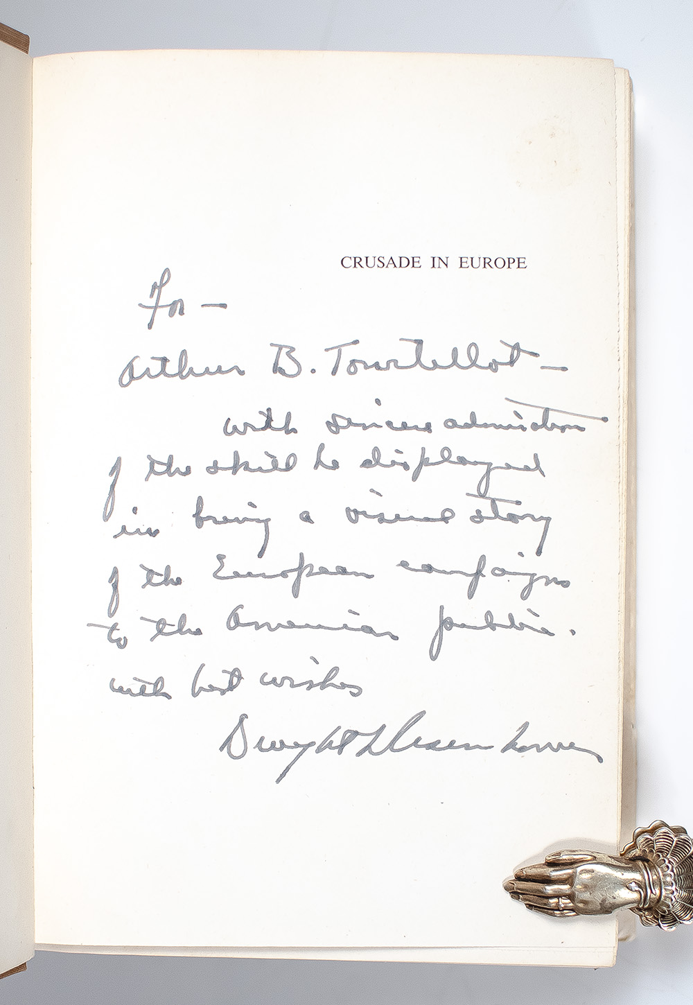First edition, early printing of General Eisenhower's wartime memoirs. Octavo, original cloth, illustrations and maps, including four double-page color maps of the European theatre and battlefields. Association copy, inscribed by the author on the half-title page, "For Arthur B. Tourtellot- with sincere admiration of the skill he displayed in bringing a visual story of the European conflict to the American people with best wishes Dwight D. Eisenhower" at half-title. Recipient's bookplate facing inscription. Arthur Bernon Tourtellot produced "Crusade in Europe" as a television series at CBS, based on Eisenhower's book; Eisenhower's inscription here acknowledges Tourtellot's key role in the adaptation. The television series included original World War II footage and narration closely adhering to Eisenhower's writing. Near fine in a very good dust jacket. An exceptional example with noted provenance.