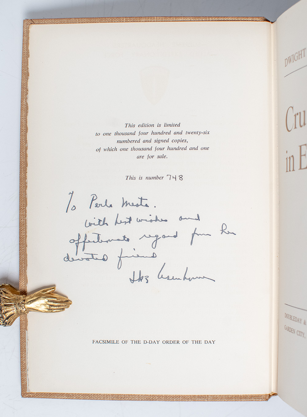 “YOU ARE ABOUT TO EMBARK UPON THE GREAT CRUSADE, TOWARD WHICH WE HAVE STRIVEN THESE MANY MONTHS”: LIMITED EDITION OF CRUSADE IN EUROPE; inscribed by Dwight D. Eisenhower to United States Ambassador Perle Mesta