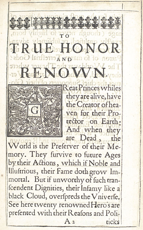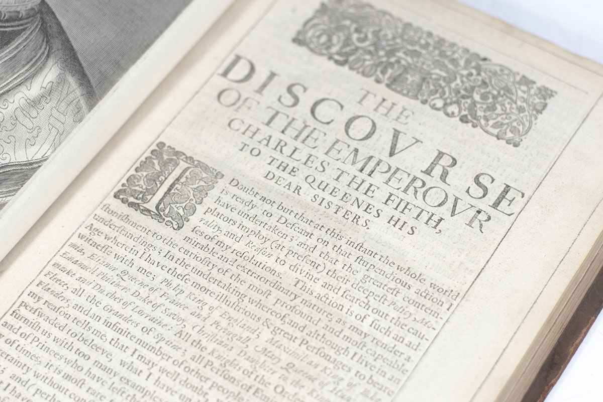 First edition in English of Scudéry's great catalogue of eminent world leaders, published early in early in Cromwell’s Commonwealth. Small quarto, bound in full contemporary tree calf with gilt tooling to the spine, red morocco spine label lettered in gilt, top edge gilt, engraved frontispiece, with 11 engraved portraits including those of Emperor Charles the Fifth; Matthias Corvin, King of Hungary; Mahoment the Second, the Grand Seignior; James the First, King of England; and Henry the Eighth, King of England among others. With the final page issued by Thurloe appointing Moseley to print the work. In very good condition. Bookplates and bibliographic entry to the pastedown. Uncommon in this condition and with all 11 plates plus frontispiece intact.