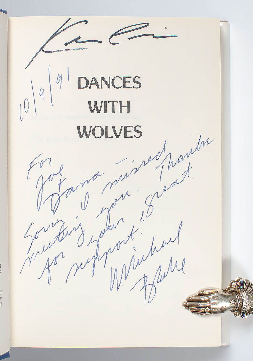 "I am Wind In His Hair. Do you see that I am your friend? Can you see that you will always be my friend?": First Edition of Dances with Wolves; Inscribed by Michael Blake and signed by Kevin Costner