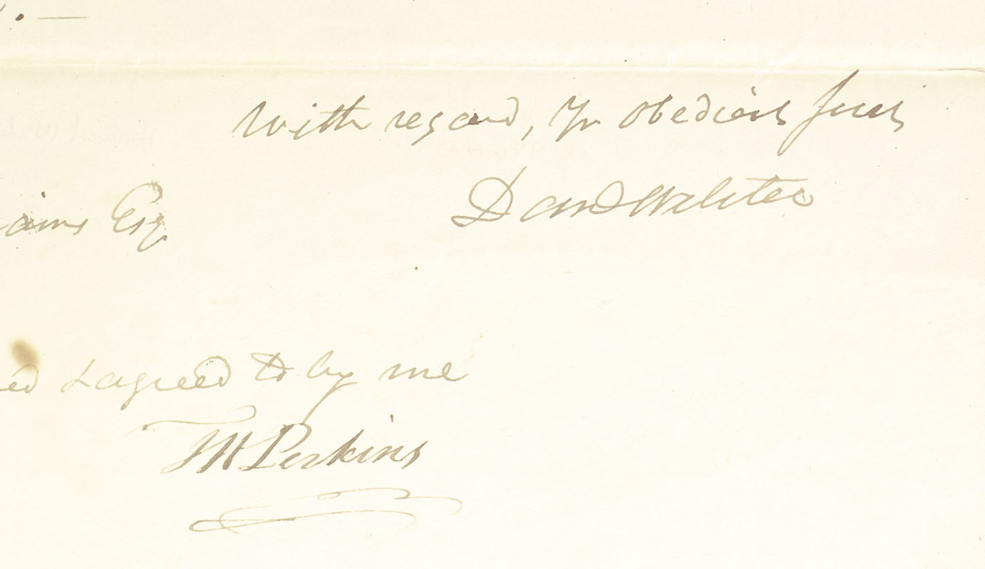 Rare autograph letter signed by one of the most prominent American lawyers of the 19th century, Daniel Webster written in anticipation of the opening of the American west. One page, folded, text in the hand of an amanuensis, the letter stipulates which types of land Webster and Perkins wish the recipient, Joseph R. Williams of Toledo, Ohio, to invest in with their $5,000 speculative fund. The reads in part, "Washington, 16 May 1836 Dear Sir, Mr. H. Perkins, Esq. of Boston, who is doubtless well known to you, at least by character and reputation, is now here. He and myself have argued to join in some investments in lands in your part of the country, and we propose to place a sum in your hands for that purpose, to be invested on the same terms and conditions as you invest other funds for me, and for Mr. Davis. The sum which we propose to place at your disposal for this purpose is five thousand dollars; of which three fourths are to be invested for account of Col. Perkins, and one fourth on my account. Of course, we leave the choice of places to your discretion, looking to safety, and to the hopes of profit. We would not devise you to be too adventurous, in regard to town lots; but if you should see a good prospect of a handsome advance, in property of that kind, you will embrace the opportunity so to dispose of part of lands for agricultural purposes, in townships already settles and settling, near to great lines of communication, and taken up at Government prices, cannot well fail to produce handsome returns on the capital. Still we should be very glad if you could make a lucky hit, at some point where the land should soon be wanted for town purposes, or where it would be met by some canal, or other improvement, which should enhance its value... As to the mode of remittance, we have thought of no better way than for you to draw on me. I shall be in this city until the early part of Jun, perhaps later, and then in Boston... As commercial transactions in your quarter may enter in New York and Philadelphia, your Bills on me may be made payable either at Boston, or at the Merchants Bank in the city of New York, or the Bank of the United States at Philadelphia... You will of course write me, on the receipt of this. You will see what day shall be fixed on for the adjustment of Congress and may take it for granted that I shall be here till about that time...." Signed at the conclusion by Webster, "with regards, Yr obedient Serv, Daniel Webster'. Additionally signed "Joseph R. Williams Esq Toledo" and "approved & agreed to by me Th. Perkins". The spring and summer of 1936 saw the admission to the Union of Arkansas and Michigan as the 25th and 26th states, respectively, and the organization of the Wisconsin Territory, essentially opening the American West as the next urban frontier. In near fine condition. Accompanied by an etched portrait of Webster.