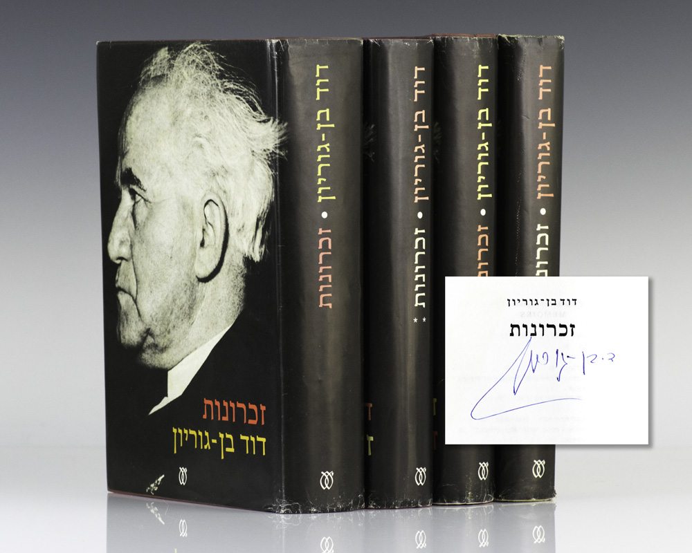 First editions of volumes 1-4 of David Ben-Gurion's memoirs in Hebrew. Octavo, 4 volumes, original cloth. Volumes 1-3 signed by David Ben-Gurion on the title page in Hebrew. Ben-Gurion lived to see the publishing of only the first three volumes. Previous owners small stamp and pen writing on front free endpapers, tape residue on the front and rear endpapers. An exceptional set, most rare and desirable signed by the founding father and the first Prime Minister of Israel.