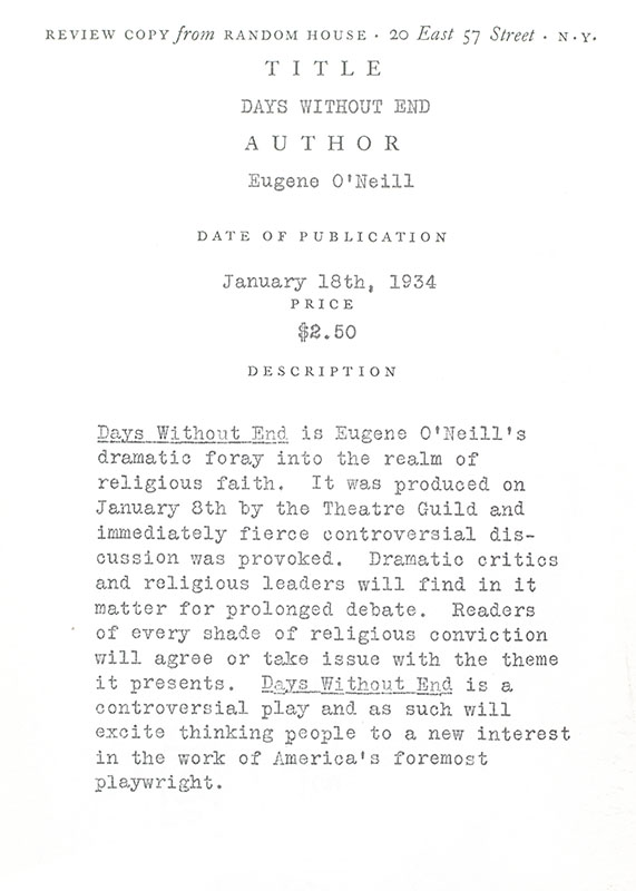 First edition, advance review copy of Eugene O'Neill's dramatic foray into the realm of religious faith. Octavo, original cloth. pictorial endpapers, top edge blue. With the publisher's advance review copy slip laid in dated January 18th 1934. Near fine in a very good dust jacket.
