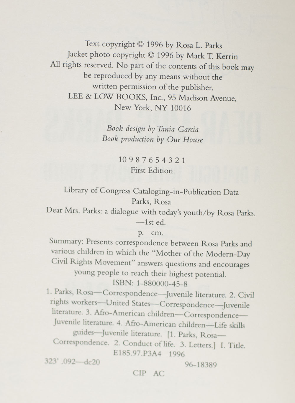 In this collection of children's letters and her responses, Rosa Parks shares her legacy of courage and wisdom, reminding young readers that their actions will determine the future. Dear Mrs. Parks is a moving commentary on our times, full of hope for the future.