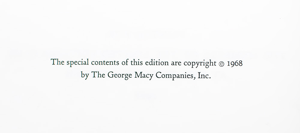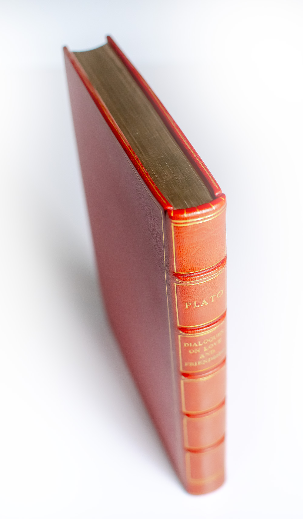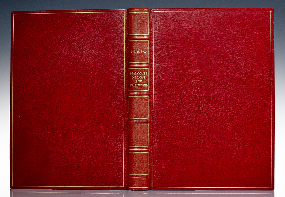 The Limited Editions Club signed limited edition of Plato’s dialogues on love and friendship. Octavo, bound in full modern morocco with gilt titles and tooling to the spine in six compartments within raised gilt bands, gilt ruling to the front and rear panels, all edges gilt, gilt turn-ins and inner dentelles, marbled endpapers, with black and white illustrations. Boldly signed by illustrator Eugene Karlin on the colophon page at the rear. One of 1,500 numbered copies, this is number 1036. In fine condition. Translated from the Greek, with introductory analyses, by Benjamin Jowett. Preface by Whitney J. Oates. Illustrated by Eugene Karlin.