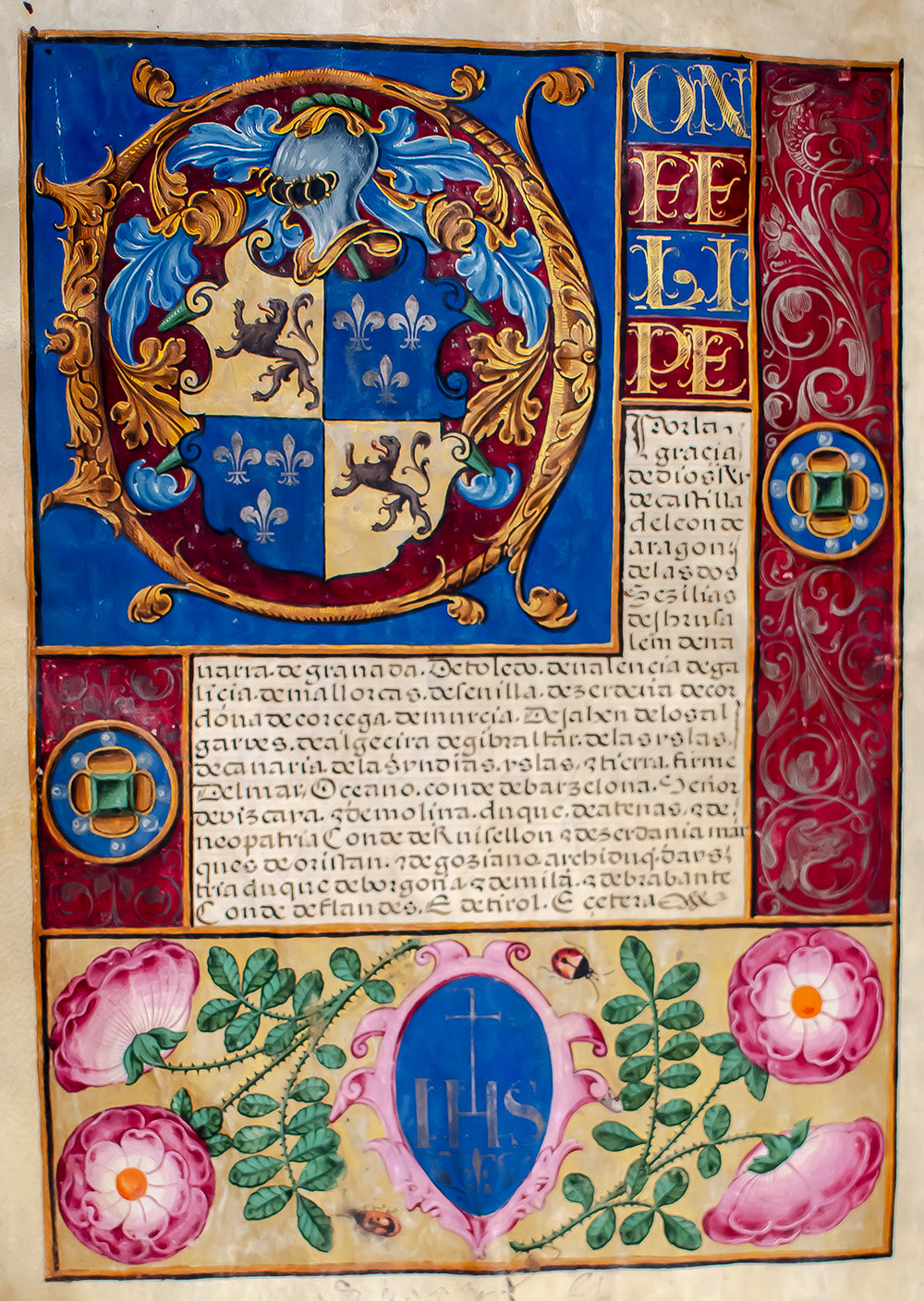 Rare 16th Century elaborately illuminated Nobility Patent of King Philip II of Spain for Diego Sanz of Lardero