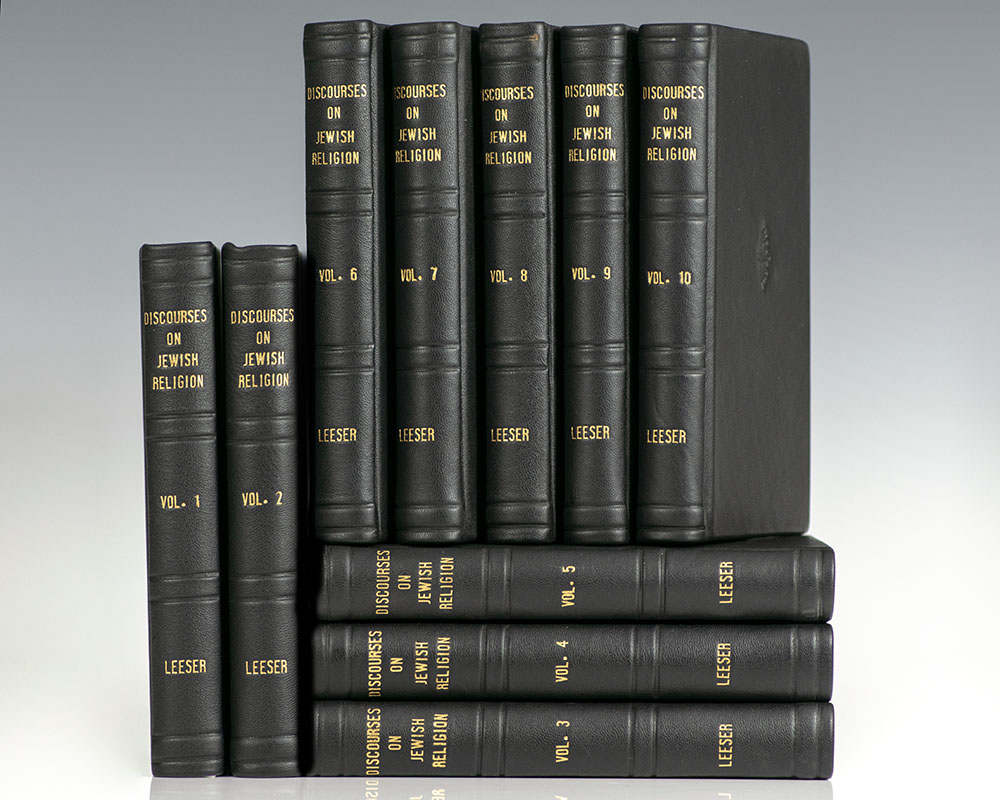 Rare first editions of one of the 'major builders of American Judaism', Isaac Leeser's Discourses on the Jewish Religion. Octavo, 10 volumes, bound in full leather, gilt titles to the spine, raised bands. In near fine condition. Complete sets are of the utmost rarity.