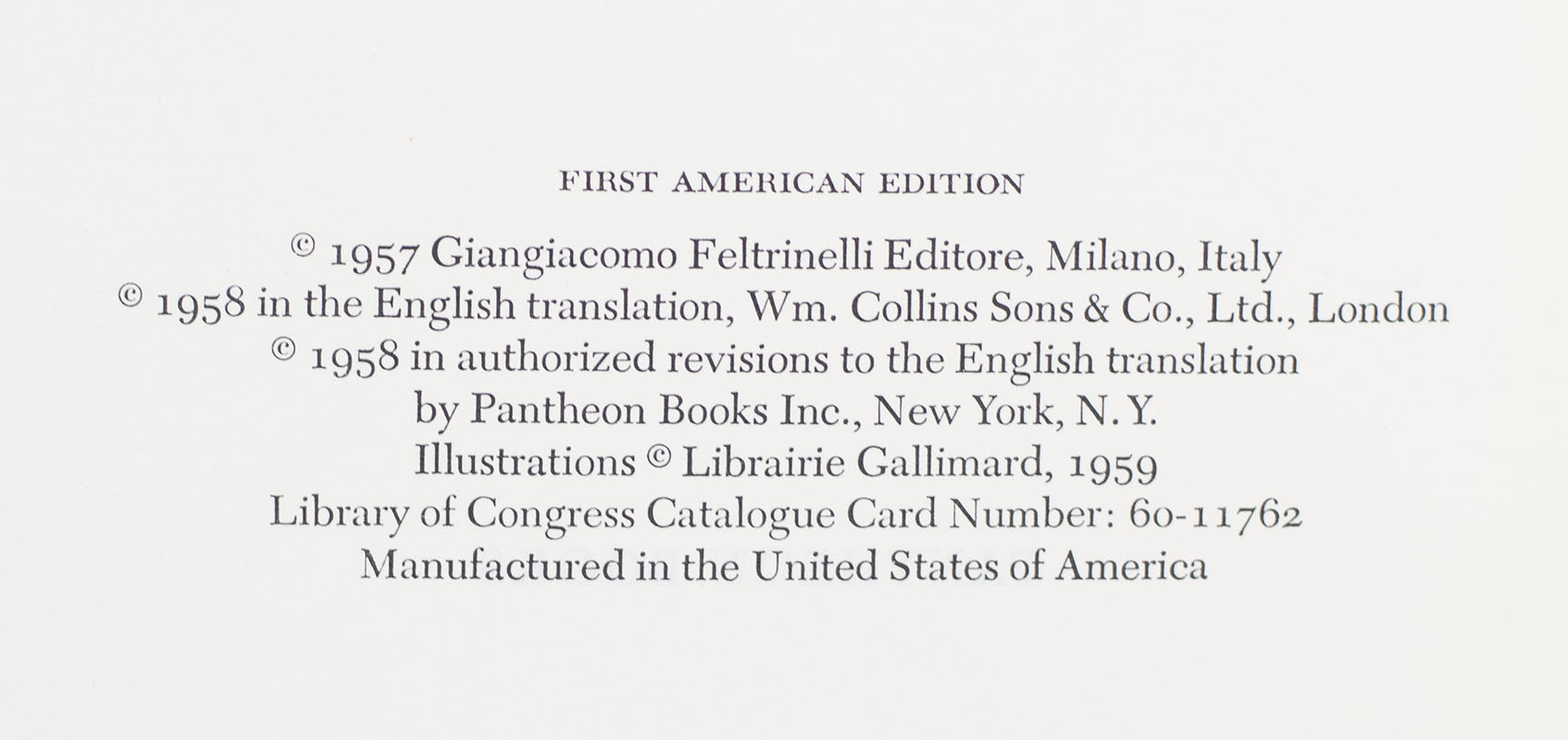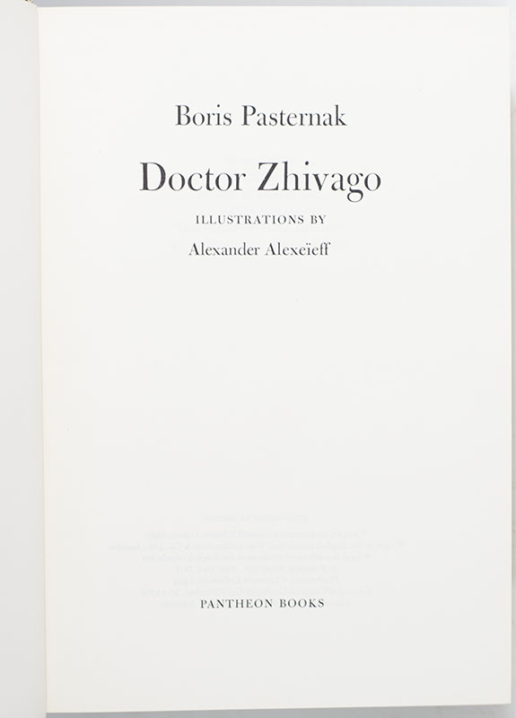 First illustrated edition of the work which garnered Pasternak the Nobel Prize in literature. Octavo, original cloth, original slipcase. Fine in a near fine slipcase. Illustrations by Alexander Alexeieff. Translated by Max Hayward and Manya Harari. An exceptional example of this literary highspot.